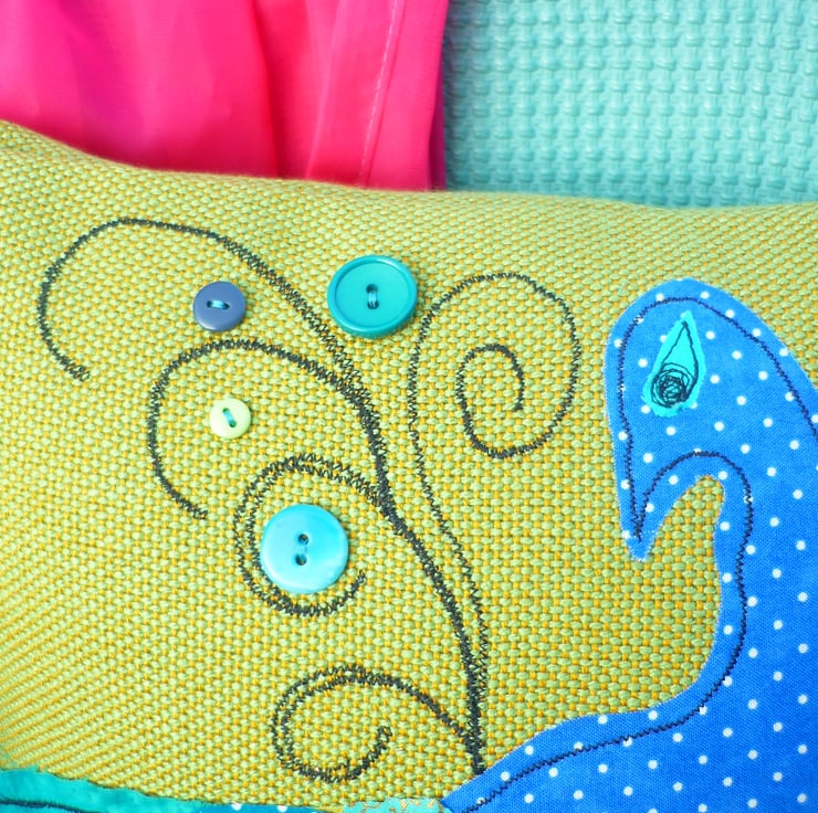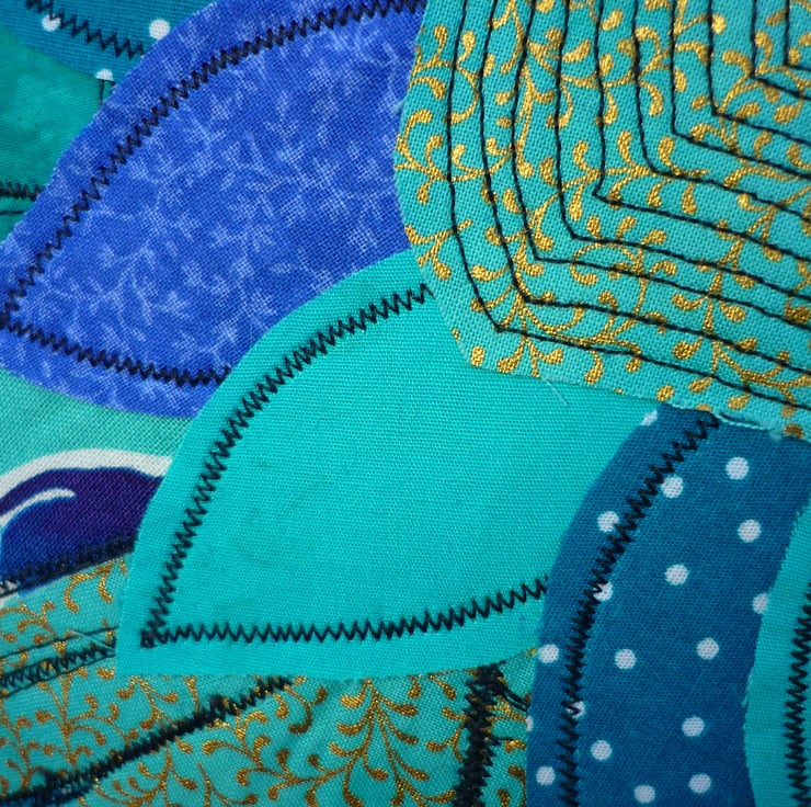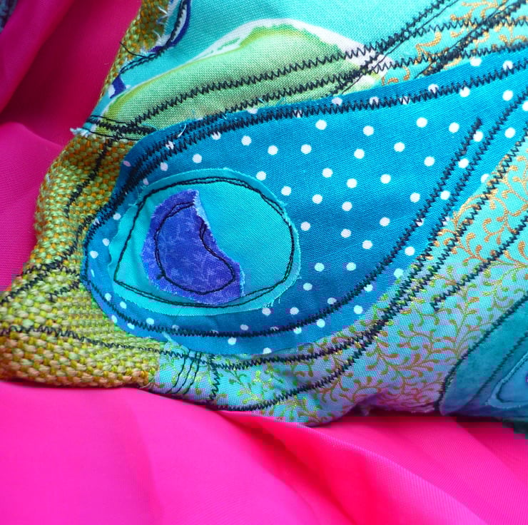 I have appliqued a peacock from wonderful vibrant quilters cottons in shades of azure blue, turquoise gold and lime greens which I have layered and free motion machine embroidered into place.