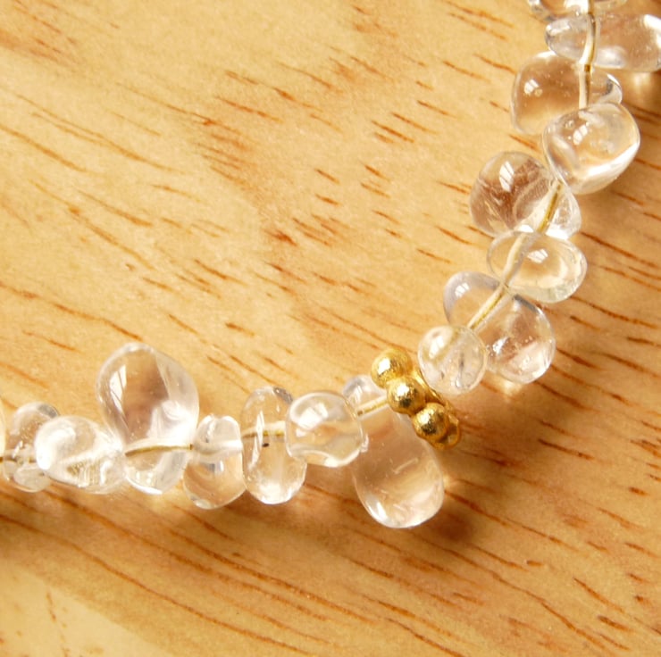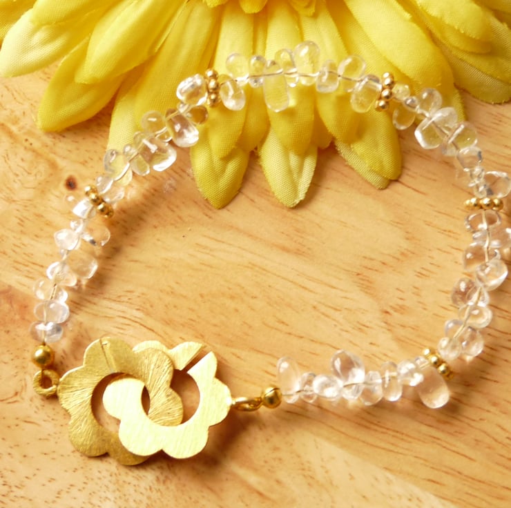 This bracelet has been made with light lemon quartz irregular nuggets approx. 5mm -11mm in length. These have simply been thread together with gold plated copper spacer beads and finished with a gold plated copper flower clasp. Approx 7.5" / 19cm in length.