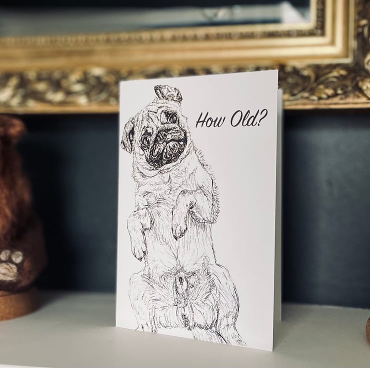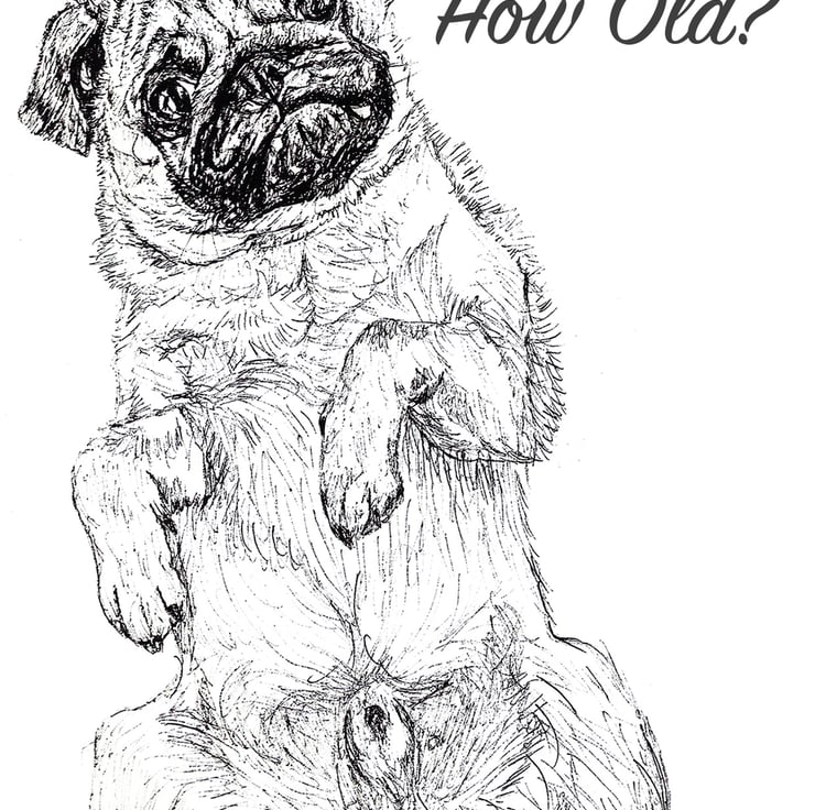 Love dogs? Share the love by giving friends and family this unique card as they get one year older. Printed from an original Ink Pen drawing by Kelly Stanley, this card features Bilbo the Pug dressed in Head Tilt mode with the caption 'How Old?'