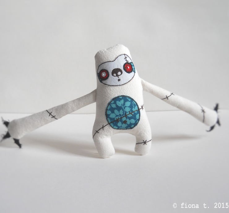 this zombie sloth is made from heavy weight calico. i pre-wash all my fabrics so they’re soft and shouldn’t shrink if washed. he’s stuffed with (CE & BS5852) polyester filling, and is finished by hand.