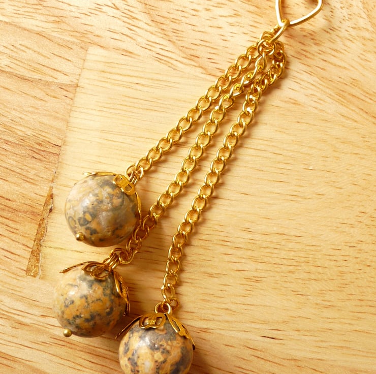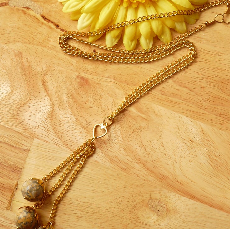 This necklace has been made with large leopard jasper rounds 16mm in size and these have simply been topped with gold plated bead caps and then attached to a gold plated copper chain with handmade clasp.