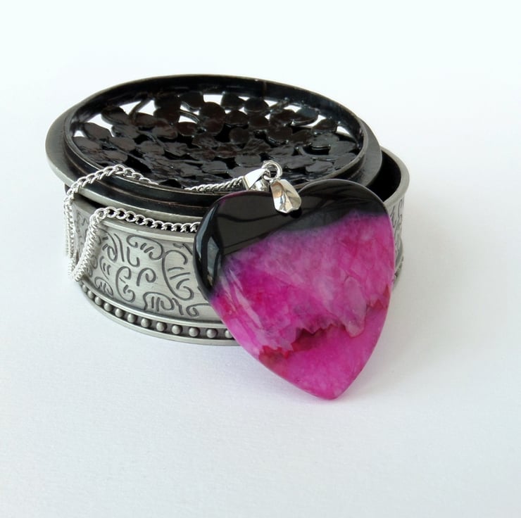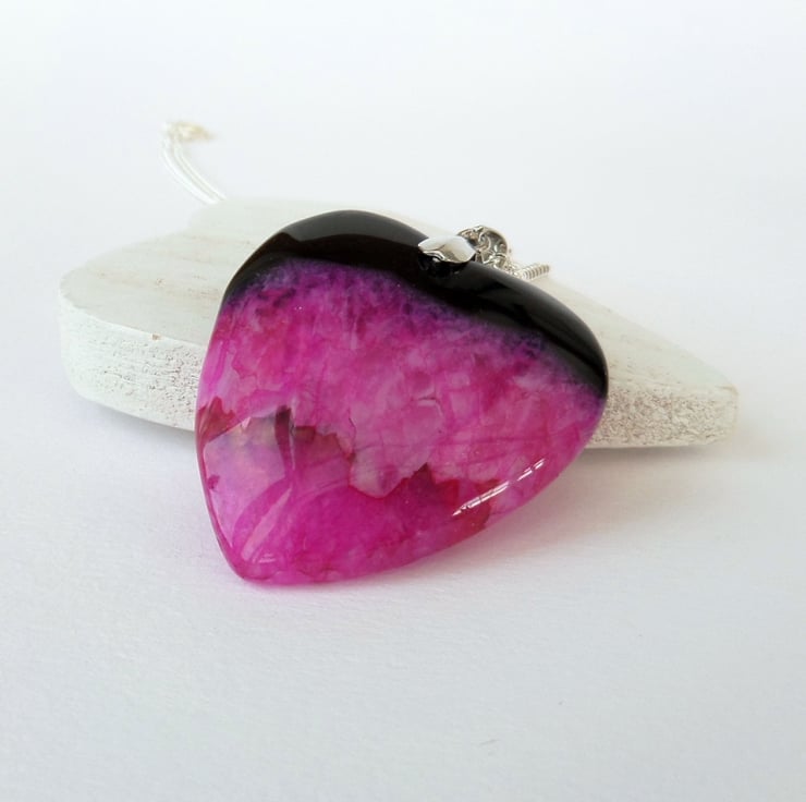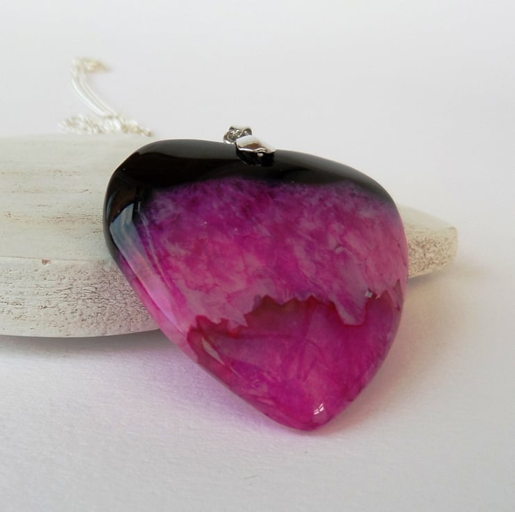 A stunning druzy agate pendant with fabulous pink and black colouring. The pendant hangs from a simple silver coloured bail on a silver plated chain.