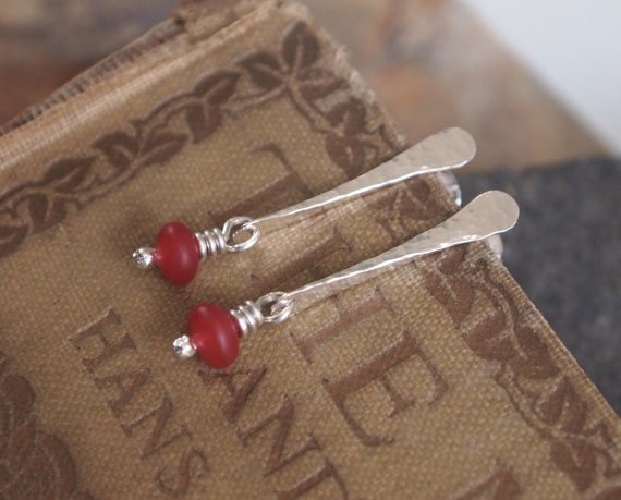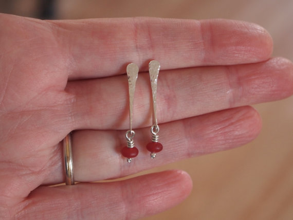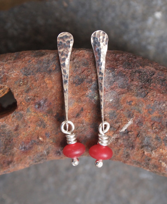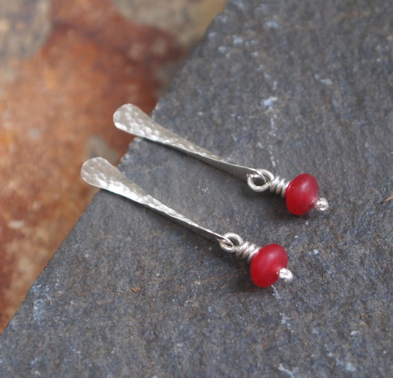 These handmade Argentium silver earrings have a rod of forged silver that has been hammered in different directions to give a bit of twist to the design. The surface of the silver is hammered further to add texture that really sparkles as they catch the light. These earrings have been burnished to a bright shine and finished with a little dangly frosted red jade bead to add a dot of colour.