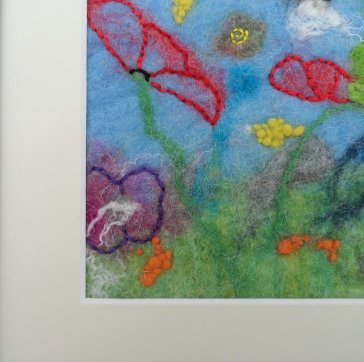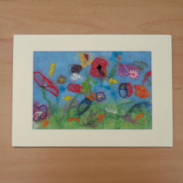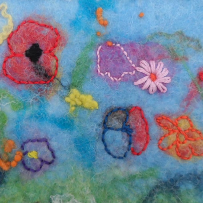 A beautiful free form wet felted and embroidered flower picture. Supplied mounted but unframed.