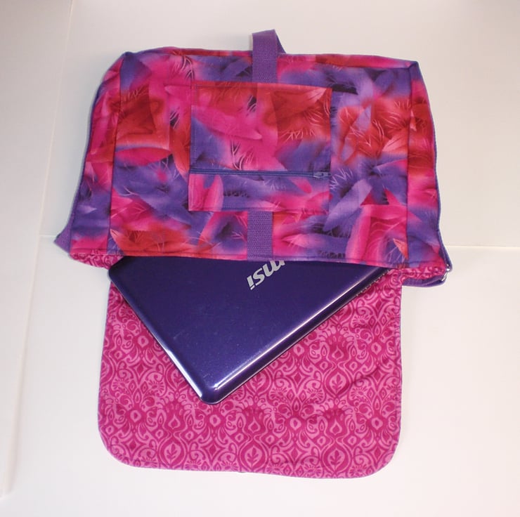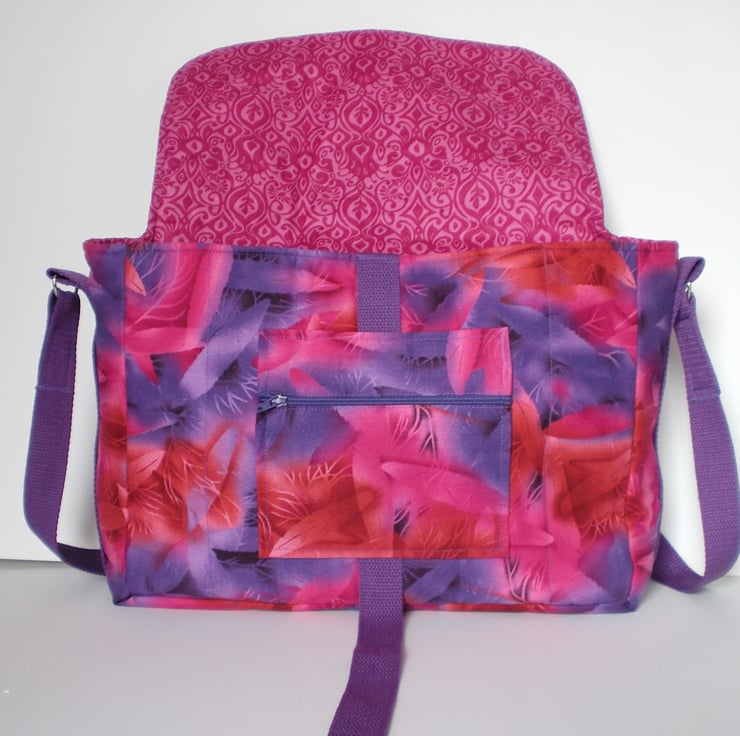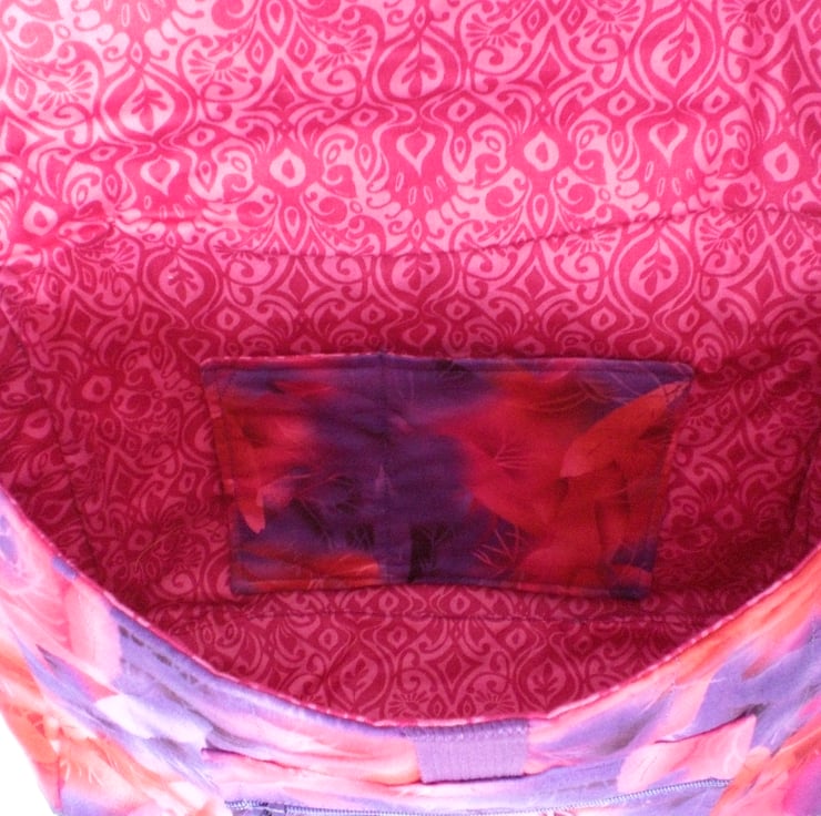 The outer fabric has a fern type pattern in pink and purple, and the lining is patterned in 2 tones of pink. There are 2 slip pockets inside and a zipped pocket under the front flap.