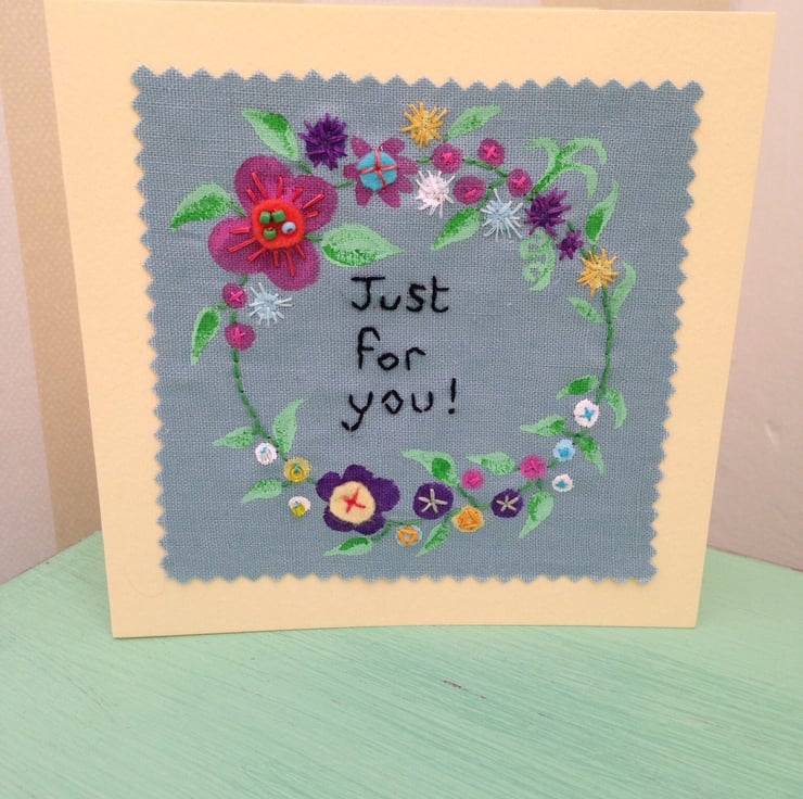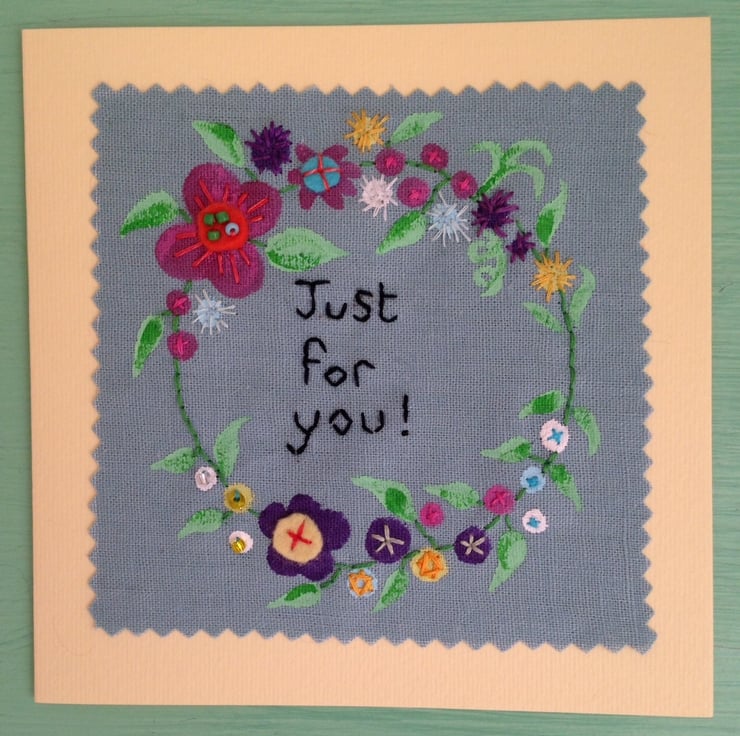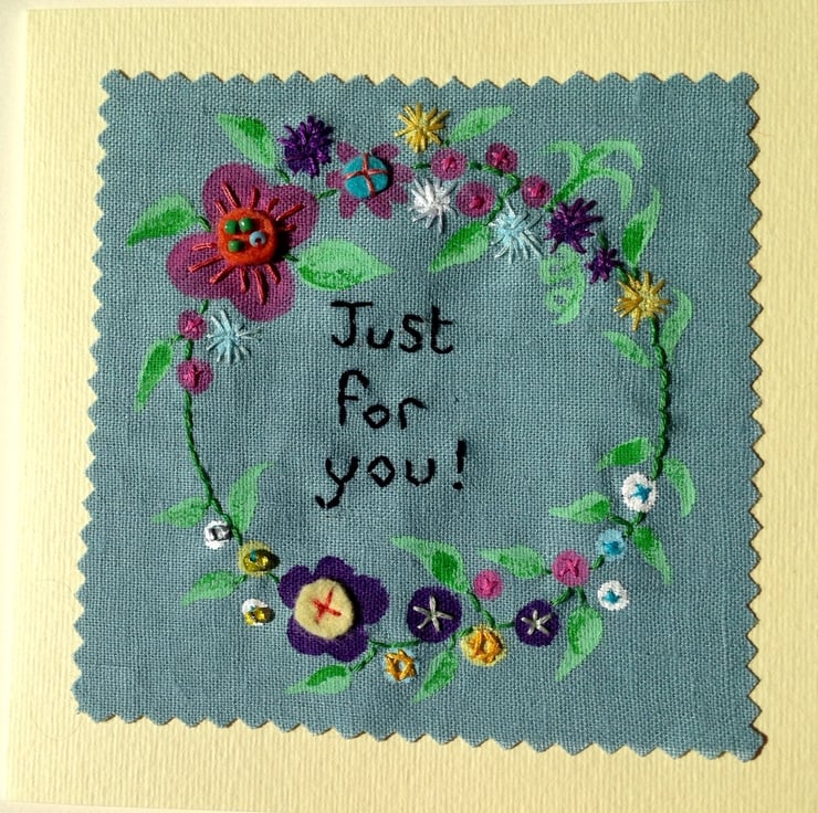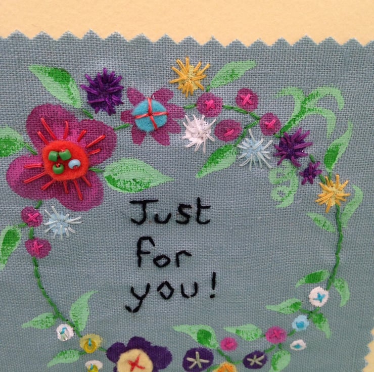 This card measures 13cm by 13 cm and comes with a white envelope. I have painted and then embroidered a wreath of flowers on a square of linen and then added some seed beads and felt to embellish the flowers. I have then embroidered the greeting in the centre. The inside has been left blank .The card will be supplied with a cellophane bag.