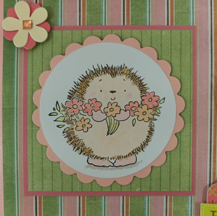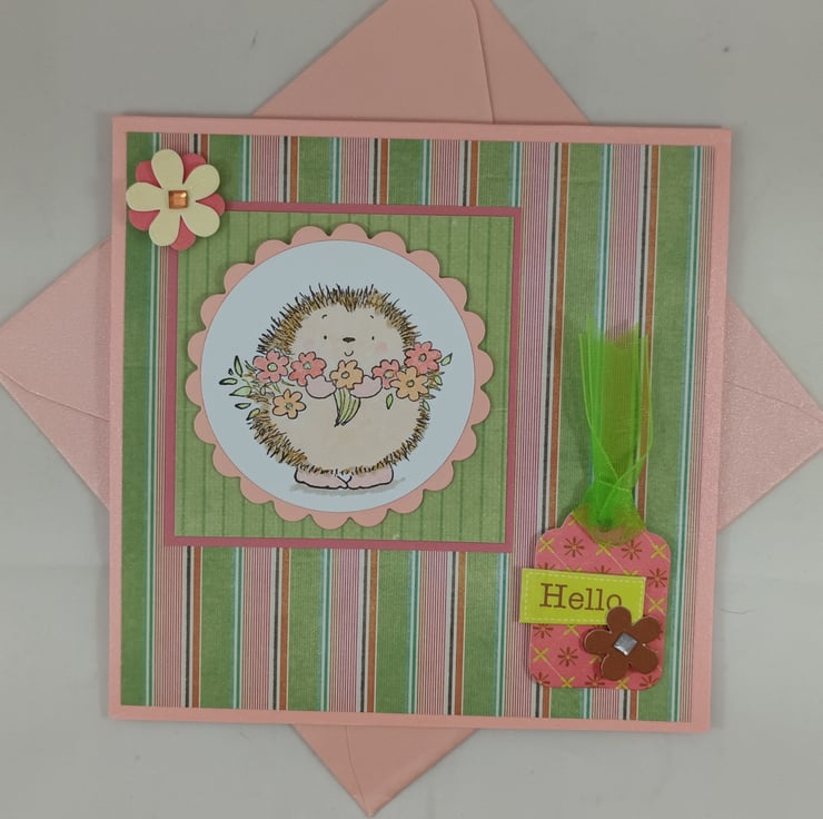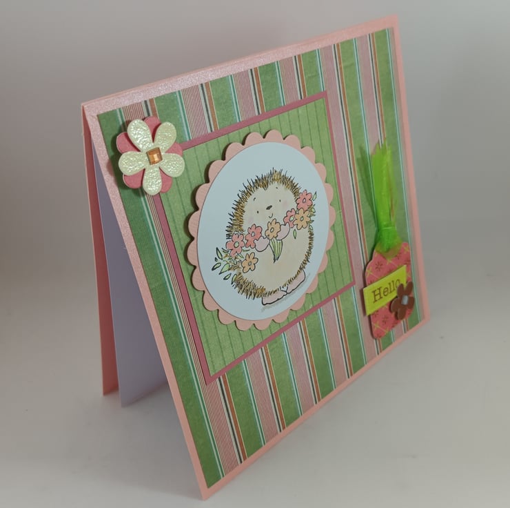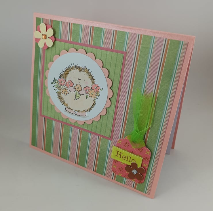 Pretty salmon pink card featuring a cute hand stamped and coloured image of a hedgehog. The image has been framed with scalloped peach card over a multi coloured striped background. The sentiment 'Hello' is attached to a small tag.