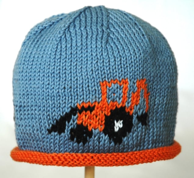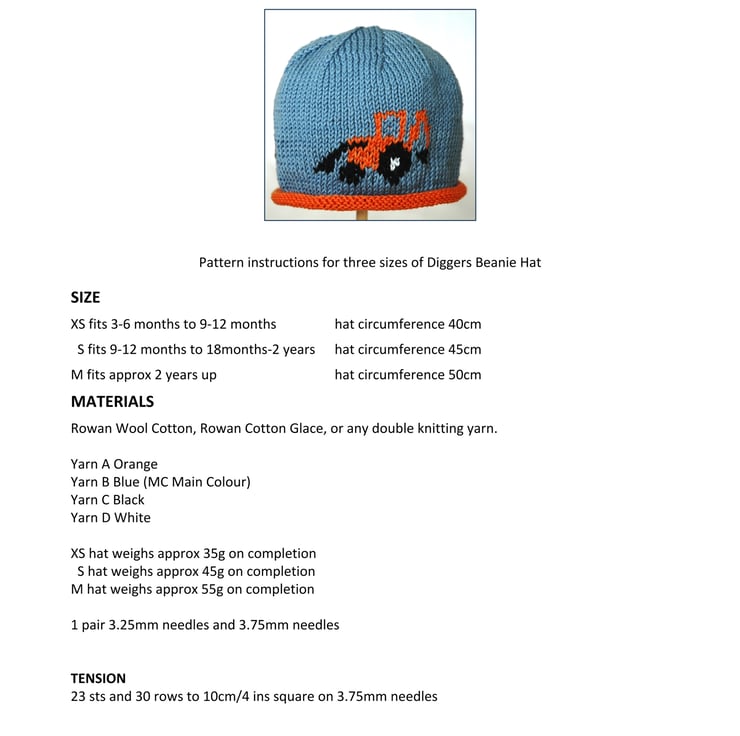 This is a knitting PATTERN for a simple beanie hat design worked on two knitting needles with a diggers motif placed evenly around each hat. (3 digger motifs on the XS and S sizes and 4 diggers on the M size). There are written instructions and charts to follow for each size and suggestions in the pattern for how to knit the motifs.