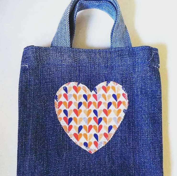These cute tiny heart tote bags are handmade from recycled fabrics in a variety of designs