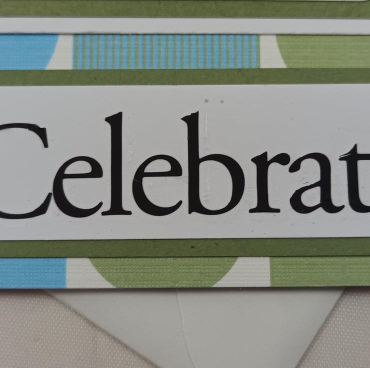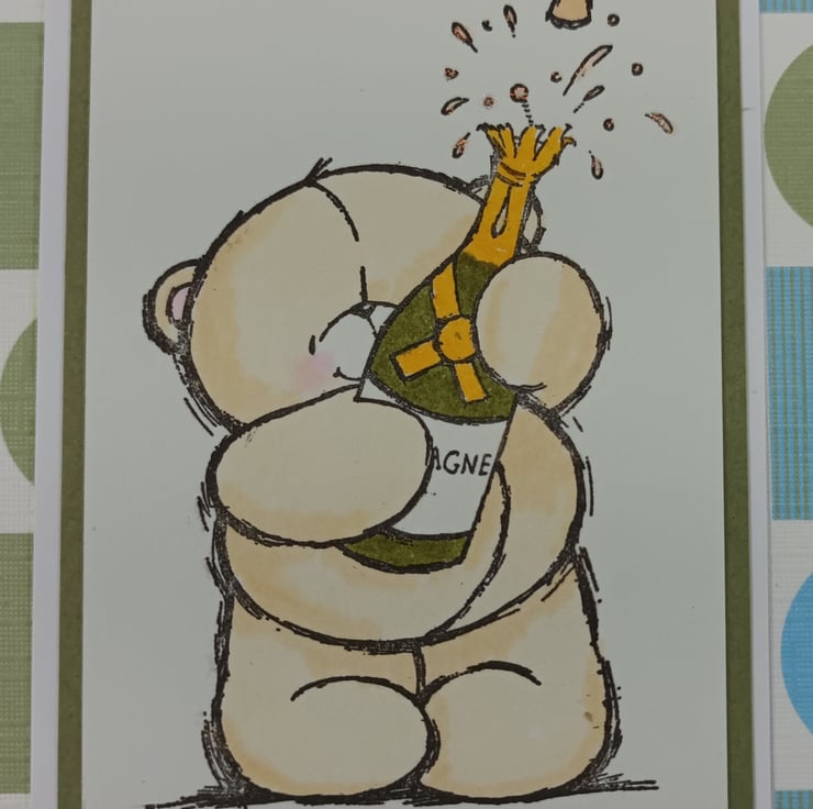 A6 card featuring a hand stamped and coloured image of a Forever Friends bear opening a bottle of champagne. The image has been mounted on green and then white card. The sentiment 'Celebrate' has been mounted onto green card over a green and blue patterned card blank.