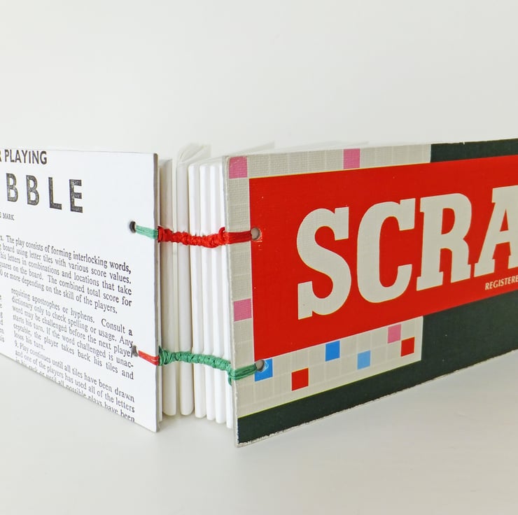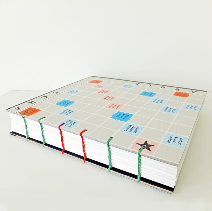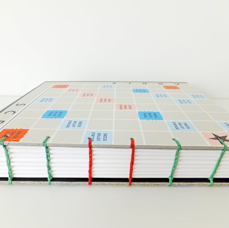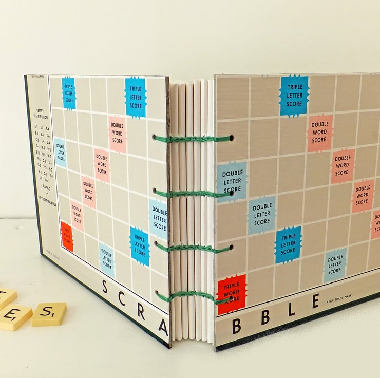 - unlined notebook made from a vintage Scrabble game board