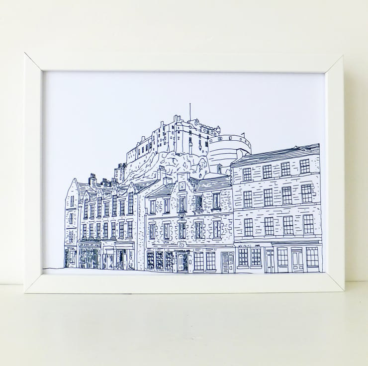 This fabulous Black and White print shows Edinburgh Castle and the Grassmarket in Edinburgh. Wonderful Scottish art for your home. This lovely Edinburgh illustration makes a great present for anyone who loves Edinburgh or who would love to visit!