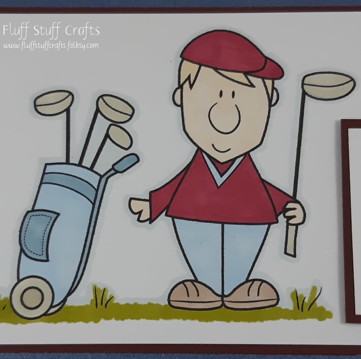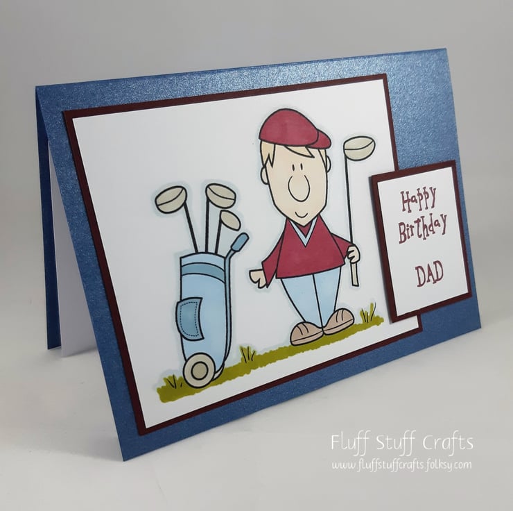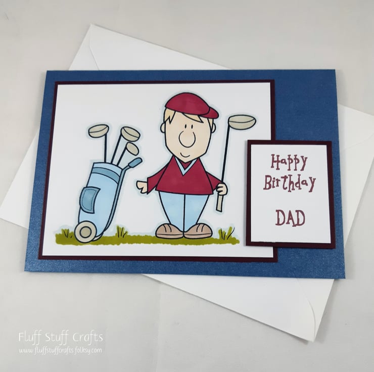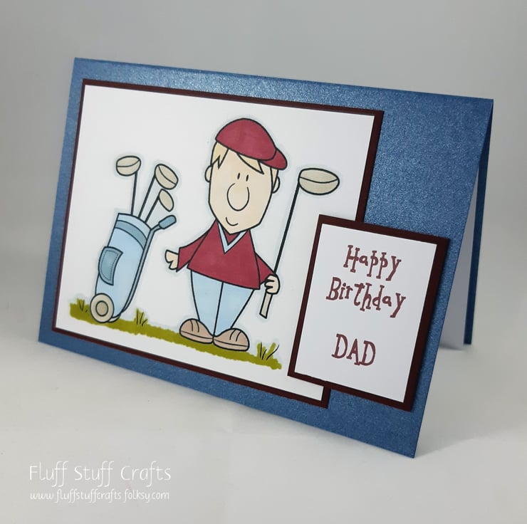 Blue A6 card featuring a hand coloured image of a male golfer, with the sentiment 'Happy Birthday Dad'. Both image and sentiment have been overlaid onto burgundy card.