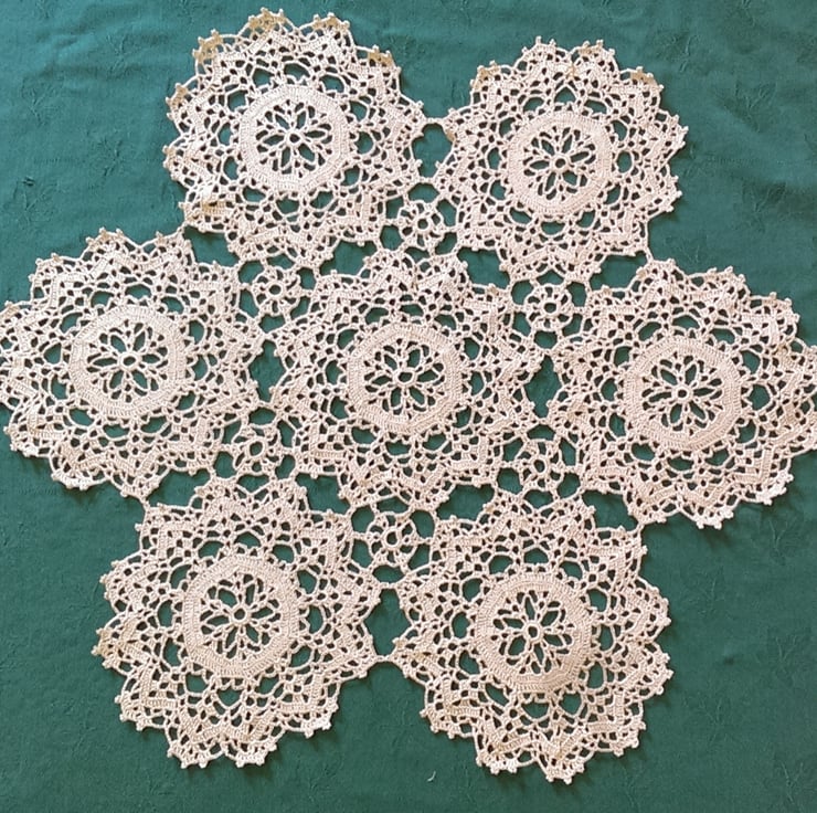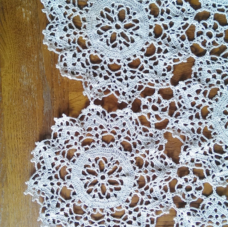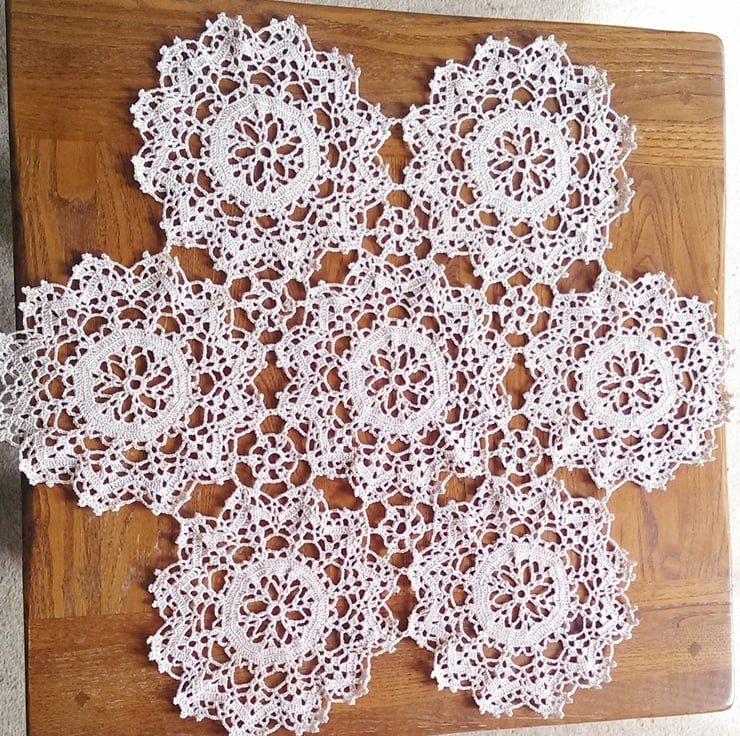 Handmade by myself, in a lovely ecru (dark cream)100% mercerised cotton - this large table decoration measures 21'' (53.5cm) point to point