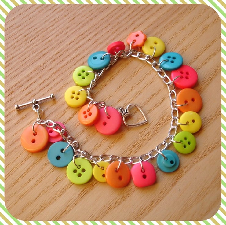 A really cute charm style bracelet which is just waiting to be shown off! This bracelet features a range of buttons. It's all put together on a silver plated chain. This fun bracelet fastens with a tibetan silver toggle clasp.