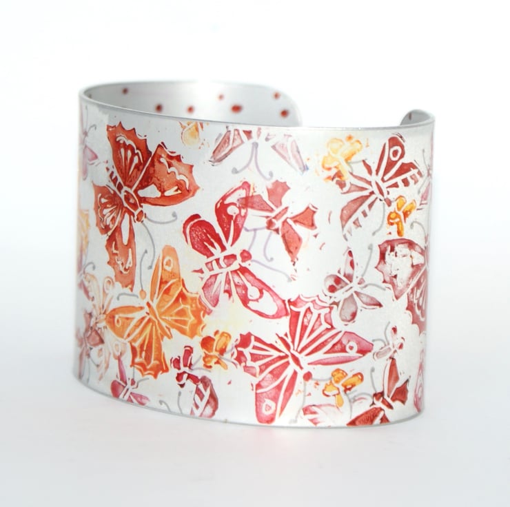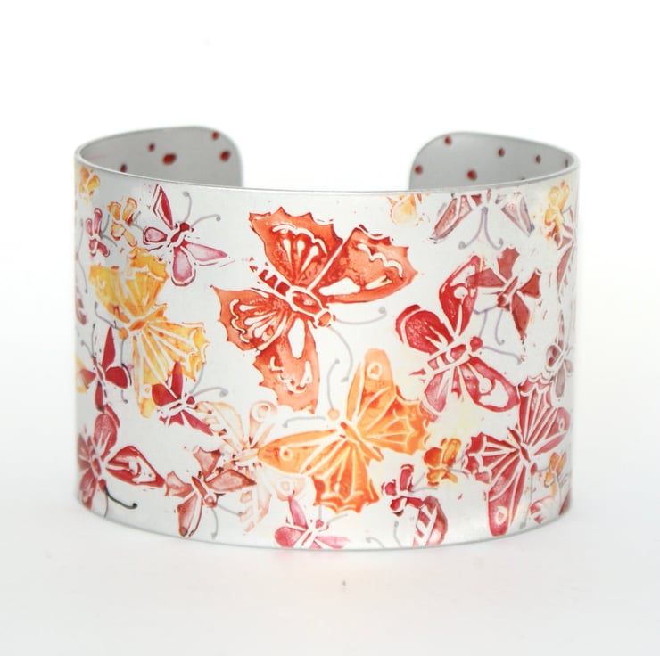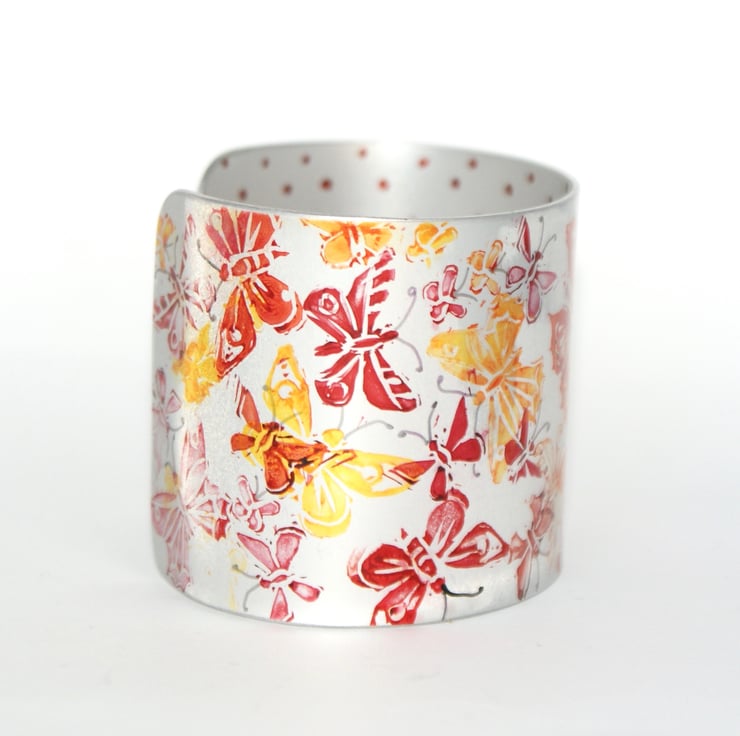 A pretty cuff featuring lots of butterflies printed onto anodised aluminium. Each butterfly has been hand cut into lino and printed by hand in reds, oranges and golds. The metal is a little flexible to allow the cuff to be put on and taken off with ease. Please note your cuff may vary slightly from the image as each one is made to order.