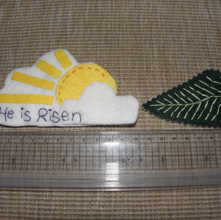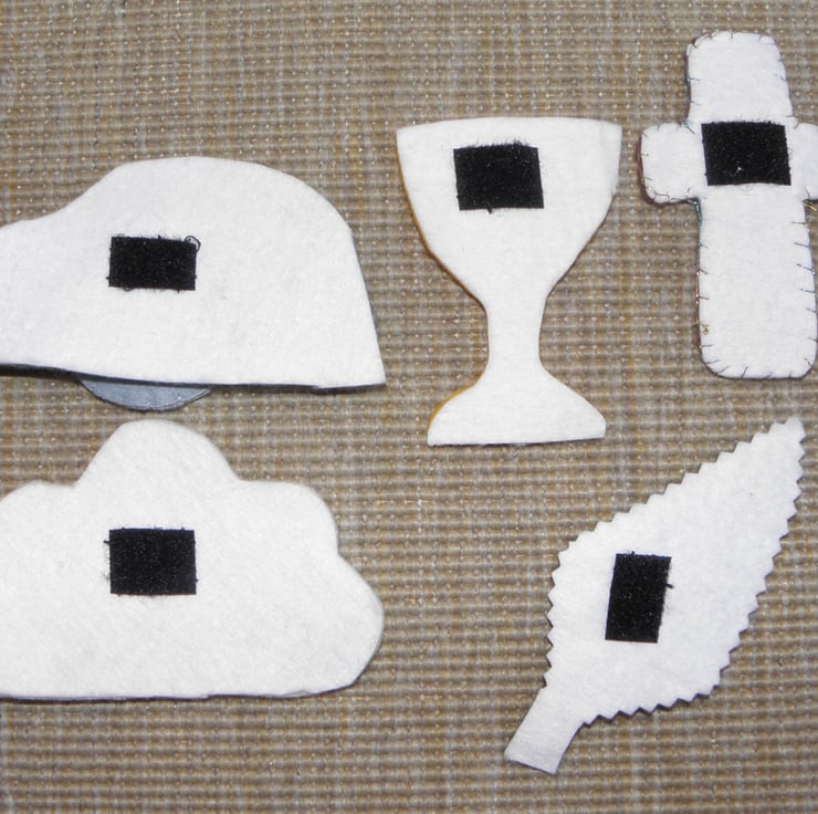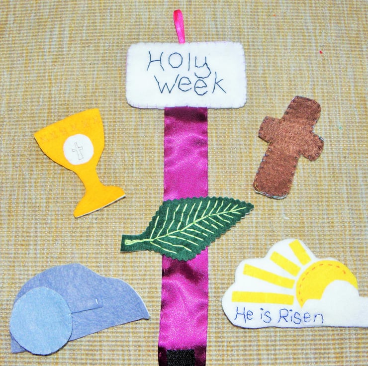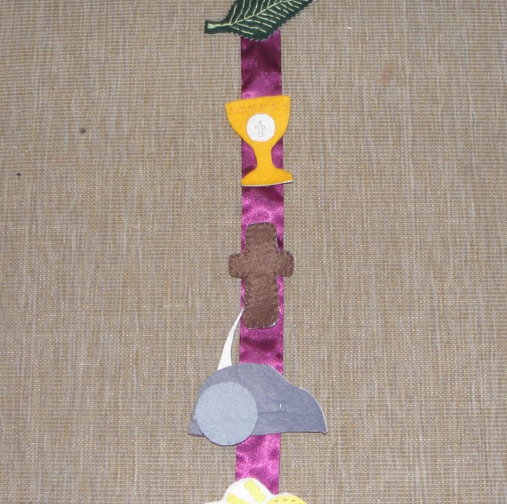 The Holy Week calendar depicts Palm Sunday, the last supper, the crucifixion, the tomb and the resurrection, made of felt pieces. Each piece attaches to purple ribbon (the colour of lent) with velcro, and a ribbon hook at the top makes it possible to hang on the wall.