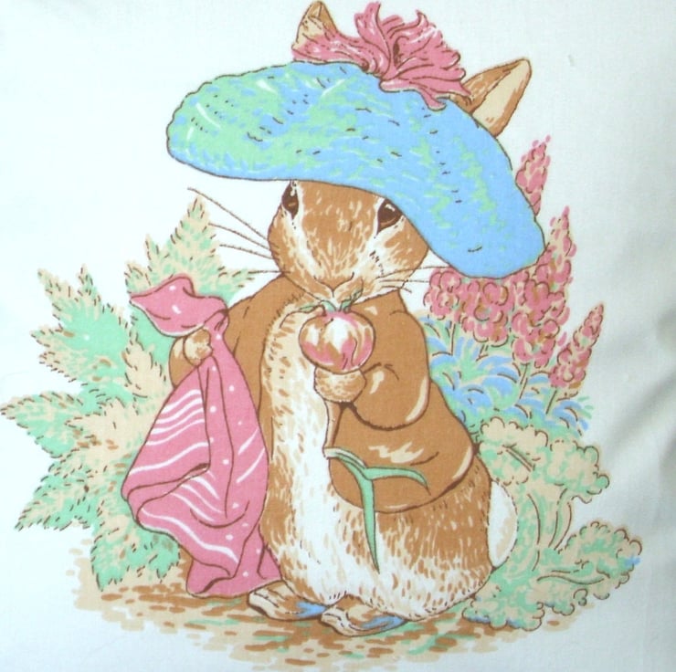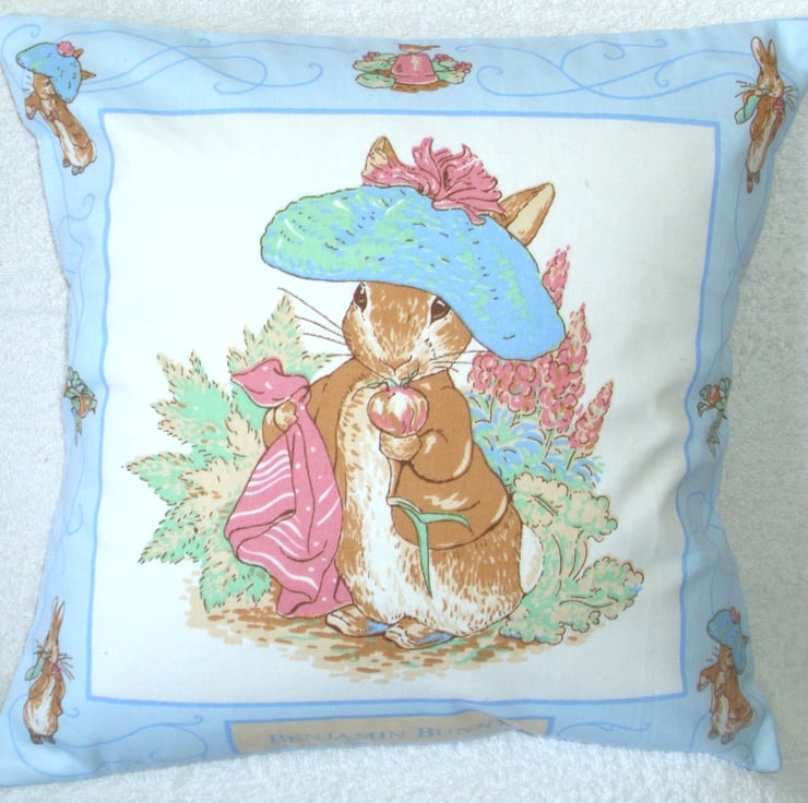 Benjamin Bunny cushion with Benjamin Bunny in his little beret and brown coat standing in Mr McGregors garden holding a radish, with mini a Benjamin Bunny in each corner.