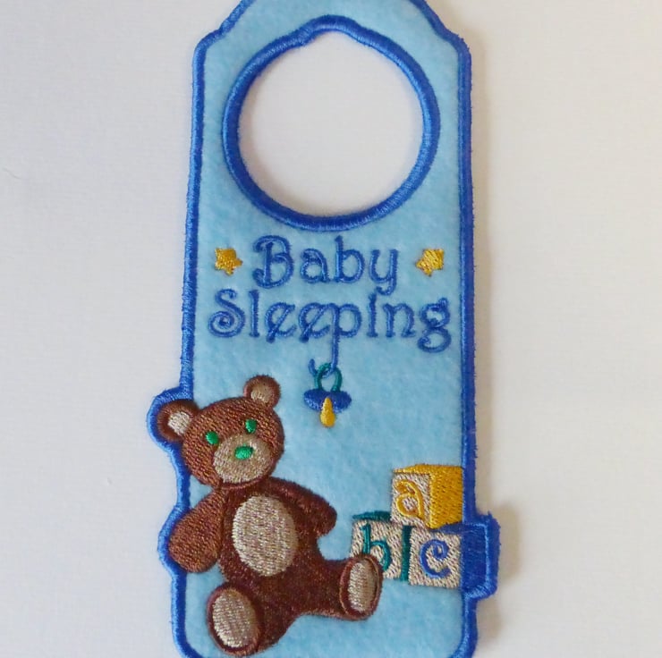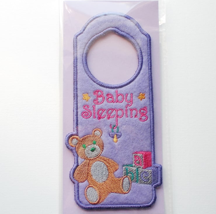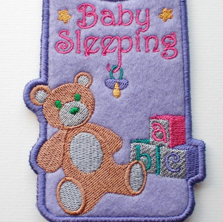 A lovely felt door hanger for when baby is sleeping, with an embroidered teddy on the front.