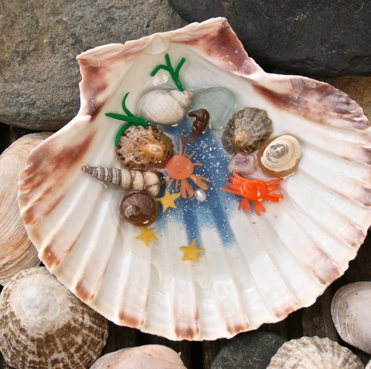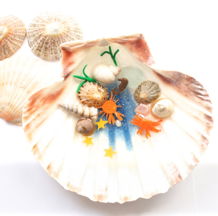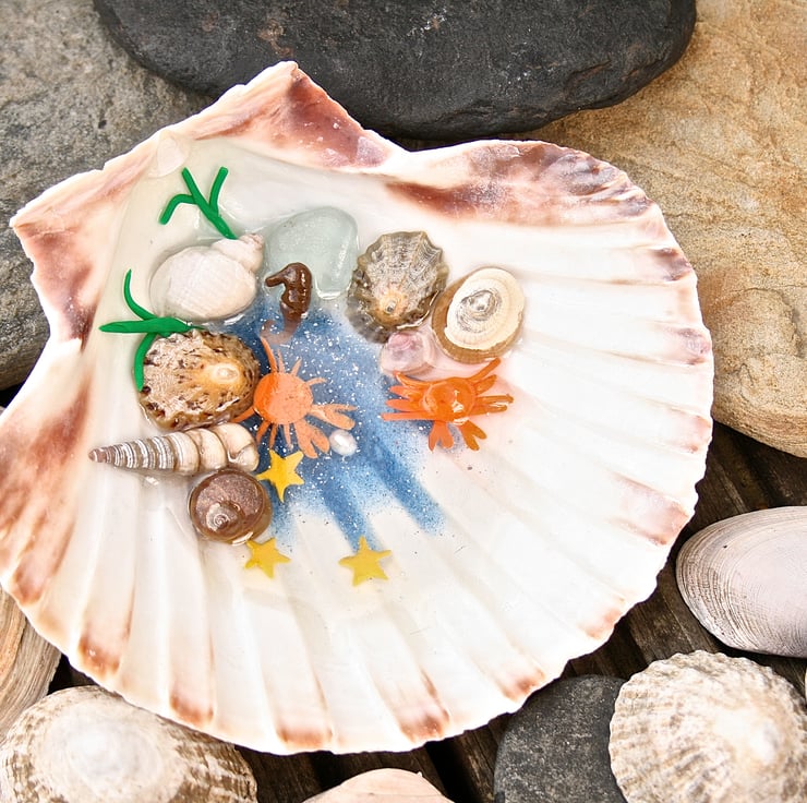 This miniature rock pool is made in a large scallop shell. The base has a layer of blue resin to provide depth to the rock pool, this has a sprinkle of glitter on the top and then more layers of resin are added with various sea creatures and shells in them. This rock pool has two miniature crabs, three star fish and a sea horse.