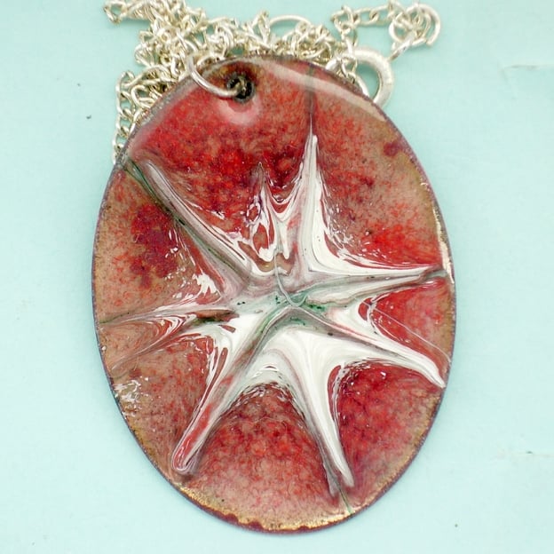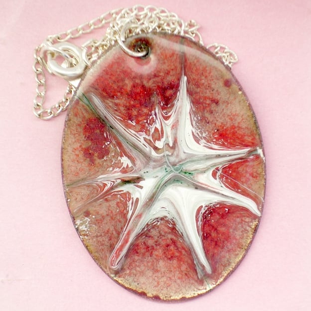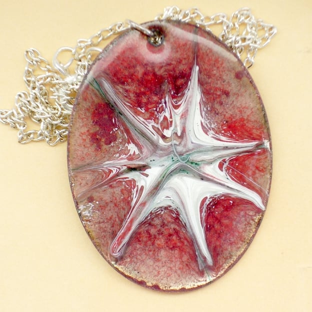 This pendant is 30mm by 40mm. The decoration is a scrolled enamel starburst in white over red itself laid over a clear enamel base giving a depth of tone and shimmer to the piece. There are hints of blue-grey in the white starburst.