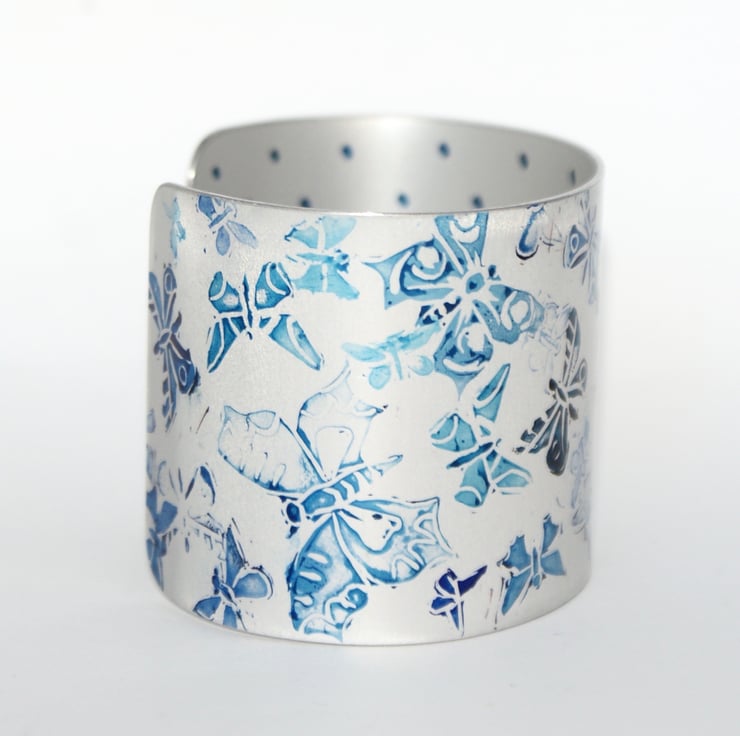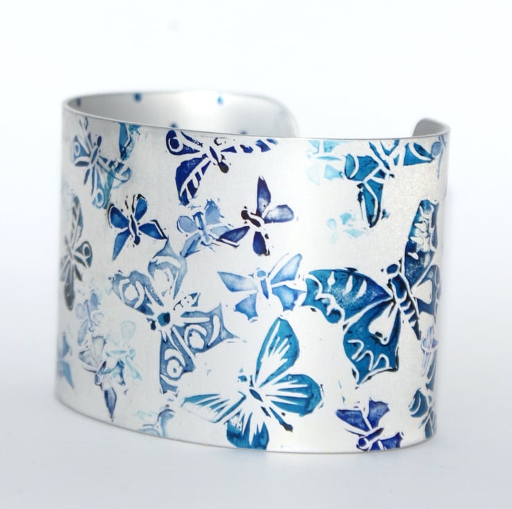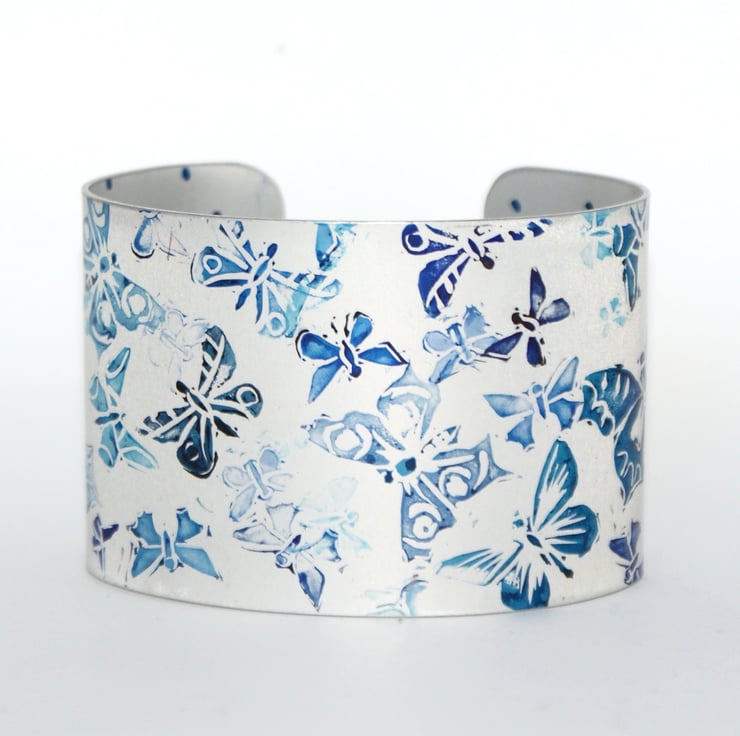 A pretty cuff featuring lots of butterflies printed onto anodised aluminium. Each butterfly has been hand cut into lino and printed by hand in shades of blue. The metal is a little flexible to allow the cuff to be put on and taken off with ease. Please note your cuff may vary from the image as each butterfly is applied by hand.