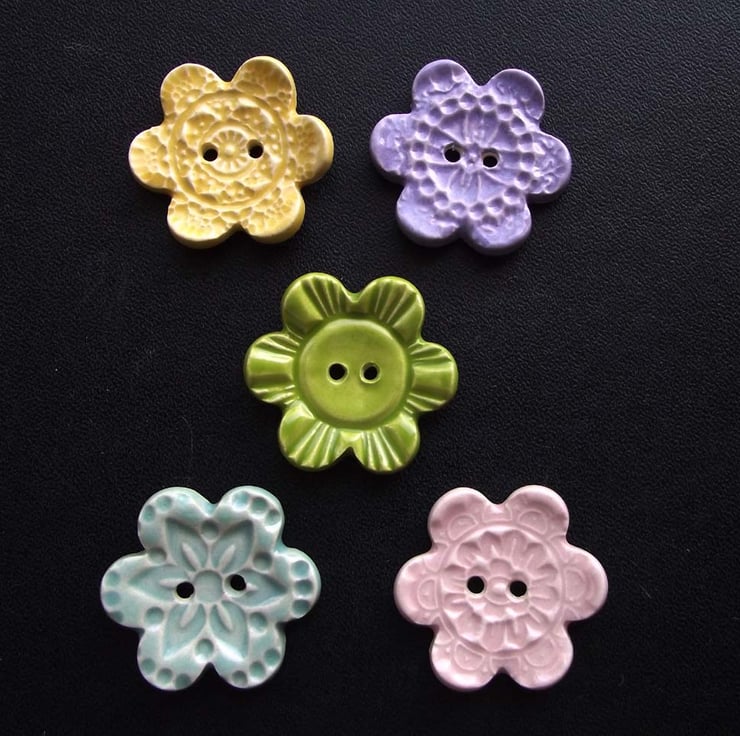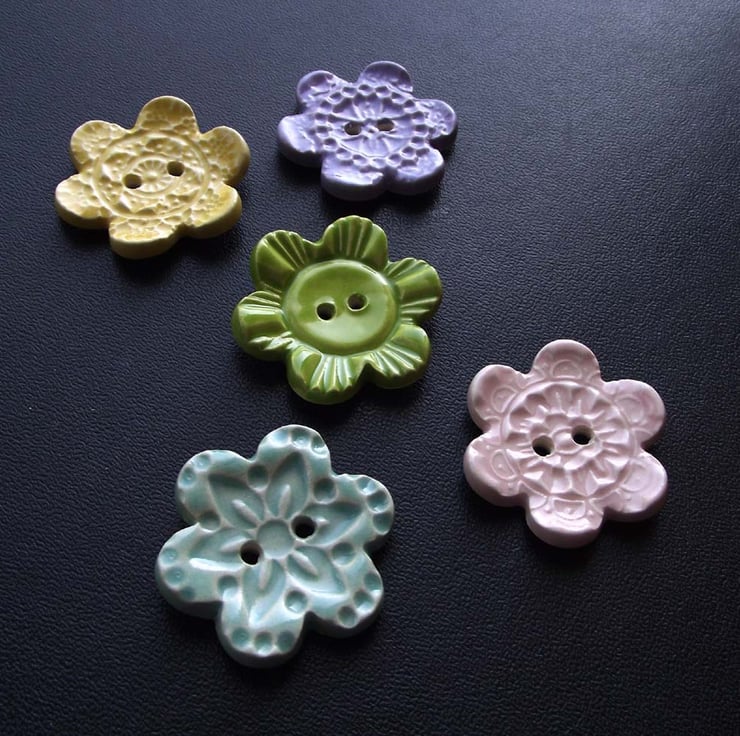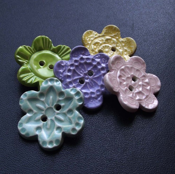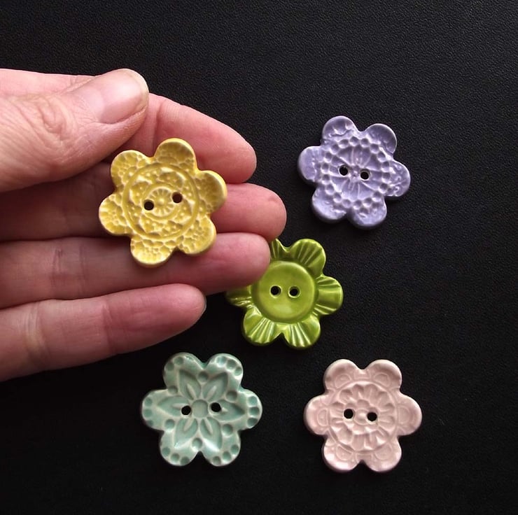 This set of five buttons are made from white earthenware clay, embossed and glazed to 1100 degrees, so nice and strong.