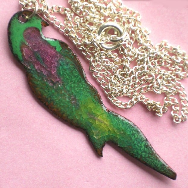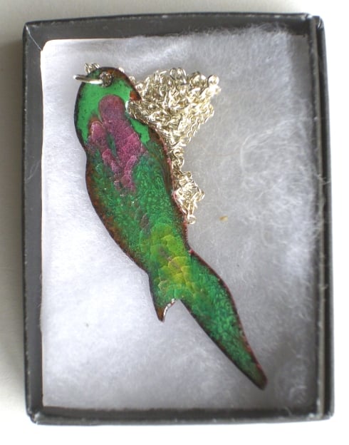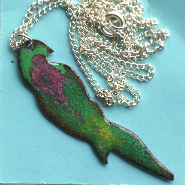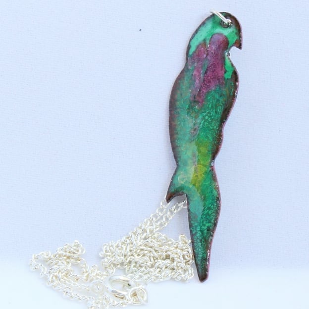 The parrot is counter enamelled. It is mounted on silver plate 45cm (18 inch) curb chain fastened with a simple bolt ring. It is sold boxed as shown.