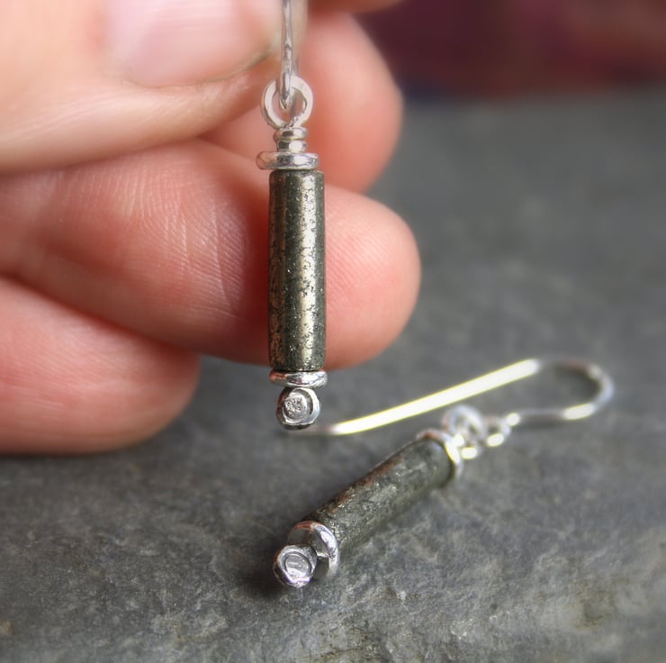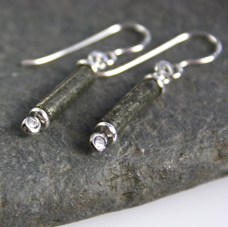 Forged sterling silver pins have been threaded through 4mm silver washer beads and semi polished pyrite tubes.