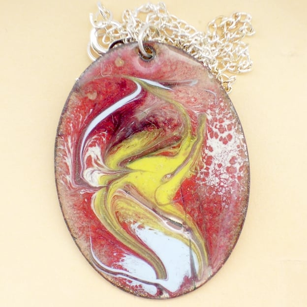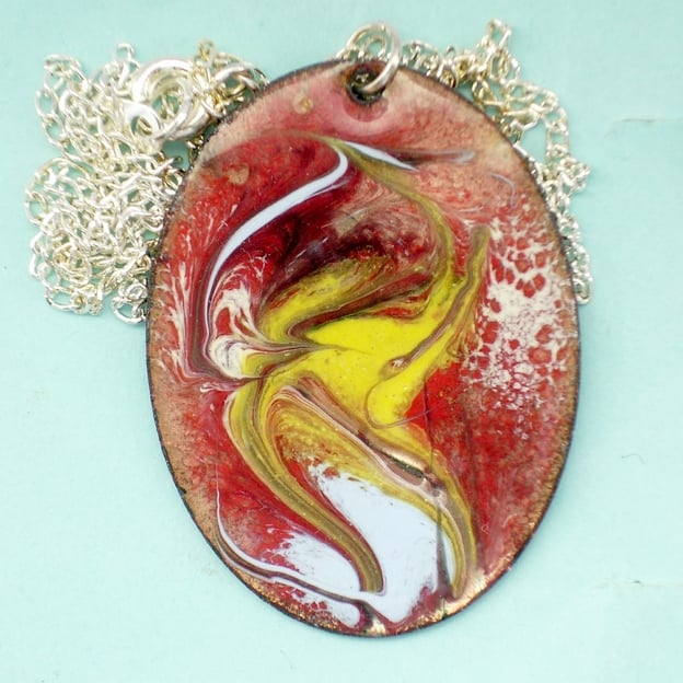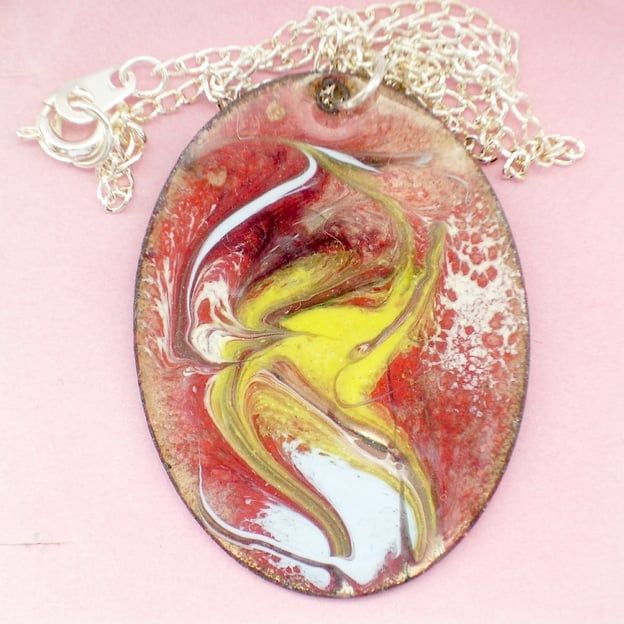 This oval pendant is 30mm by 40mm. The decoration is a scrolled enamel pattern in white, yellow and pale blue over red itself laid over a clear enamel base giving a depth of tone and shimmer to the piece where the copper base shines through golden brown.