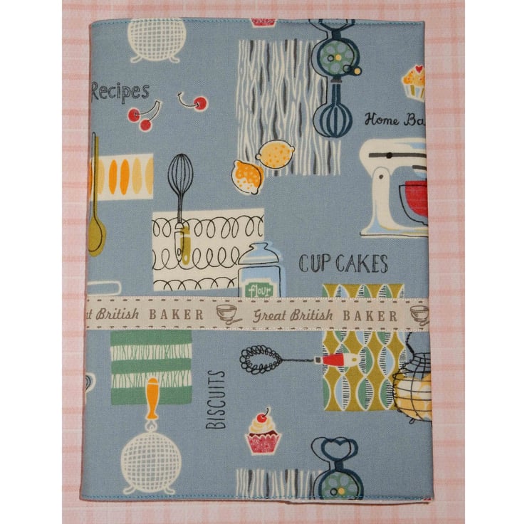 This is an A5 notebook, with good quality lined paper, it has been covered with kitchen themed fabric and the addition of ribbon reading "Great British Baker". It is interfaced and lined in plain fabric, the cover can be removed, and a replacement notebook fitted when needed.