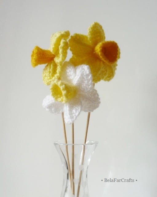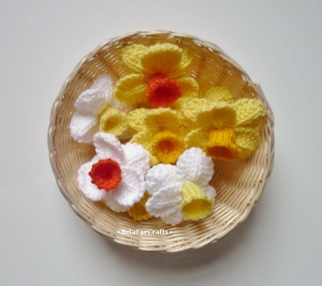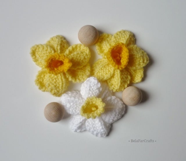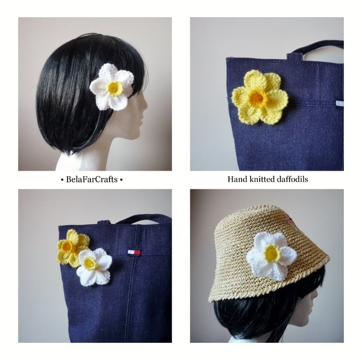 I designed and hand knitted these pretty daffodils to be enjoyed all year around in different ways.