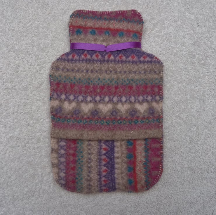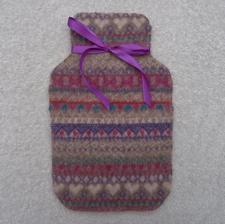 I have designed and created this fabulous hot water bottle cover from an up-cycled wool jumper. The cover is an overlapping flap design, so your hot water bottle can be easily inserted.