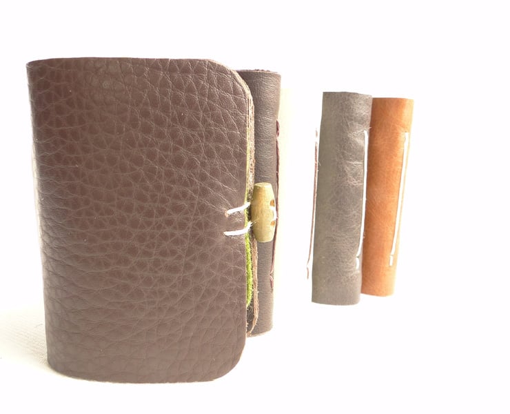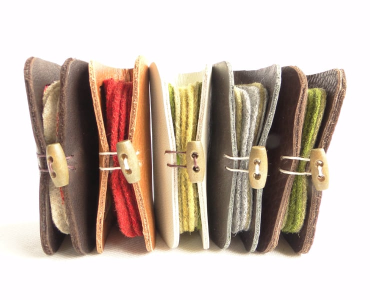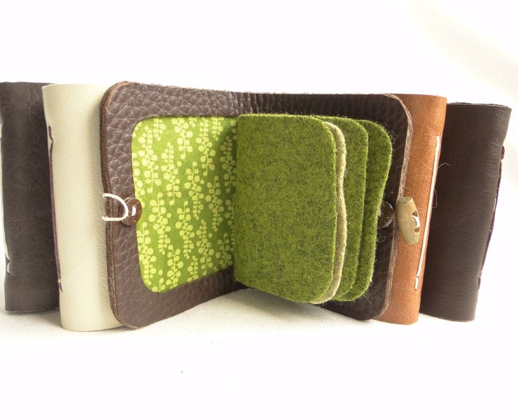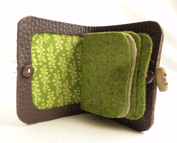 Keep them together in this brown leather case, measuring 9cm x 7xm with a spring green foliage fabric interior and six separate 'pages' for needle storage in green and cream felt. Fastened with a toggle button.