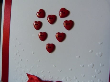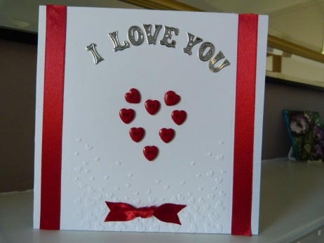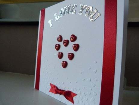 A completely hand made and uniquely designed card. Consisting of quality pristine white card which has had a pretty flutter of hearts embossed on the bottom half. A heart shape has been made from 7 heart shaped red buttons. The words I love you have been die cut from silver mirri card. Finished off with two bands of red satin ribbon.