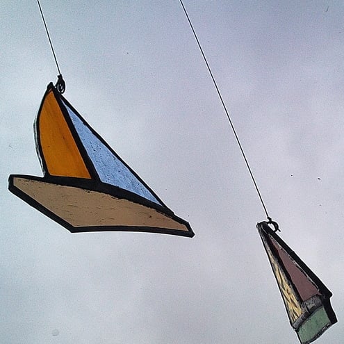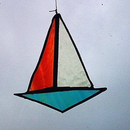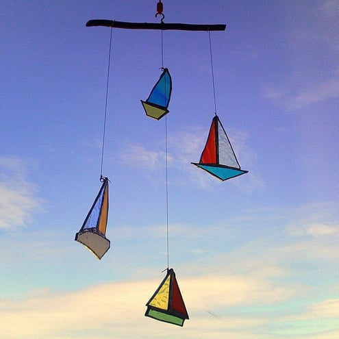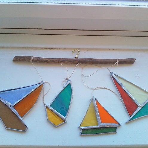 4 gorgeous boats, each one unique and made entirely from recycled glass hung with vintage thread on a lovely piece of driftwood and comes with a brass hook to hang in the window.