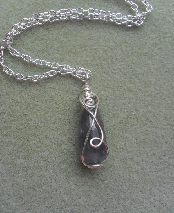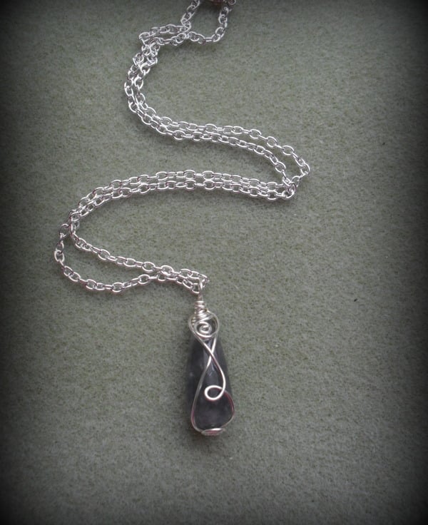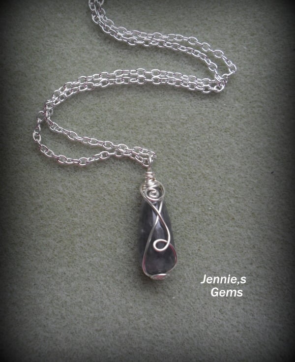 Quartz has been wire wrapped with silver coloured wire which has been coated to resist corrosion
