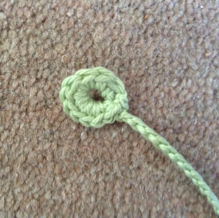 There are 4 large flowers,3 small flowers and 8 leaves hanging from a green crocheted chain with hanging loops.