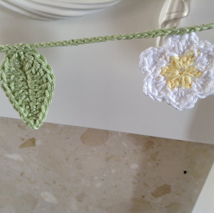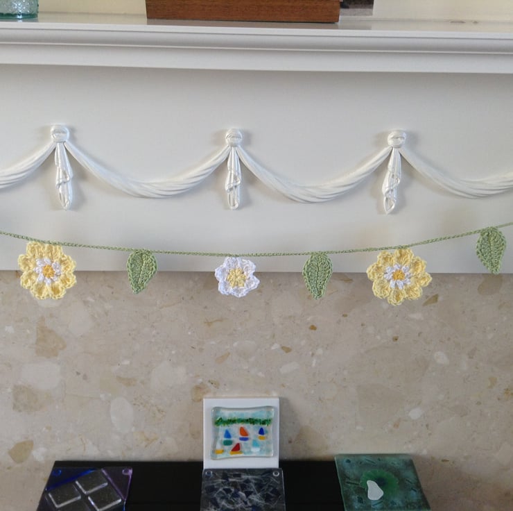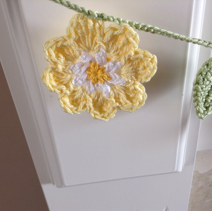 Pretty crocheted flower garland in yellow, green and white mercerised 100% cotton yarn.