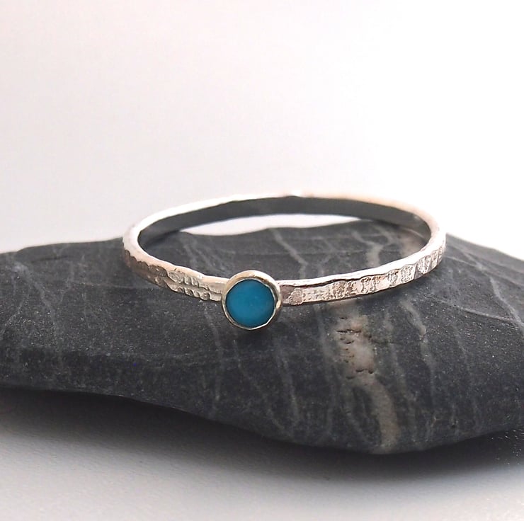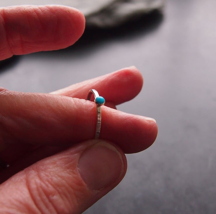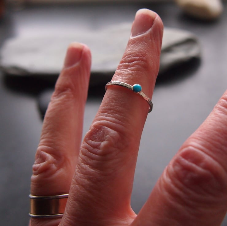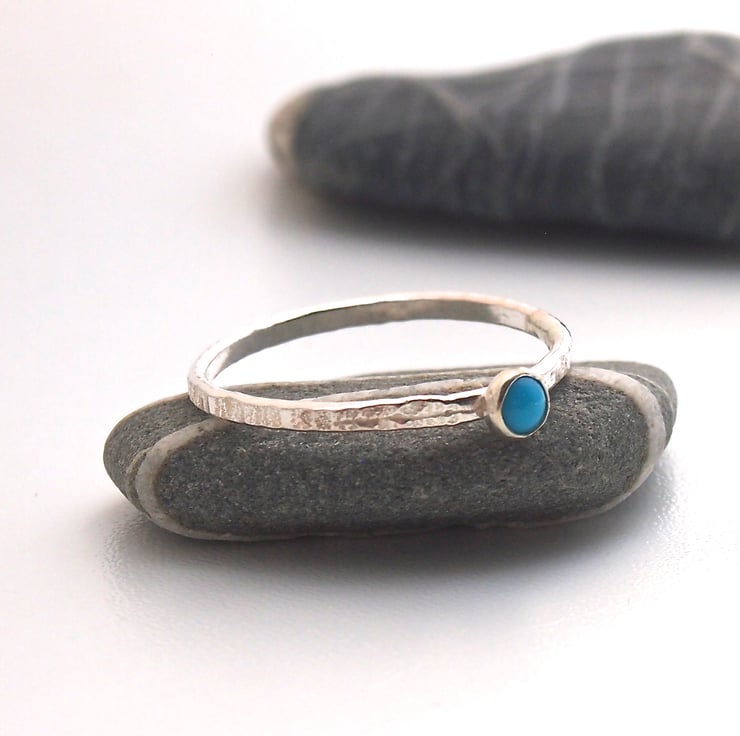 A textured 1.0 mm sterling silver flat band has a 3mm natural turquoise cabochon. Perfect to stack with any of our other stacking rings or delicate and pretty to wear alone.