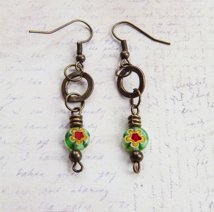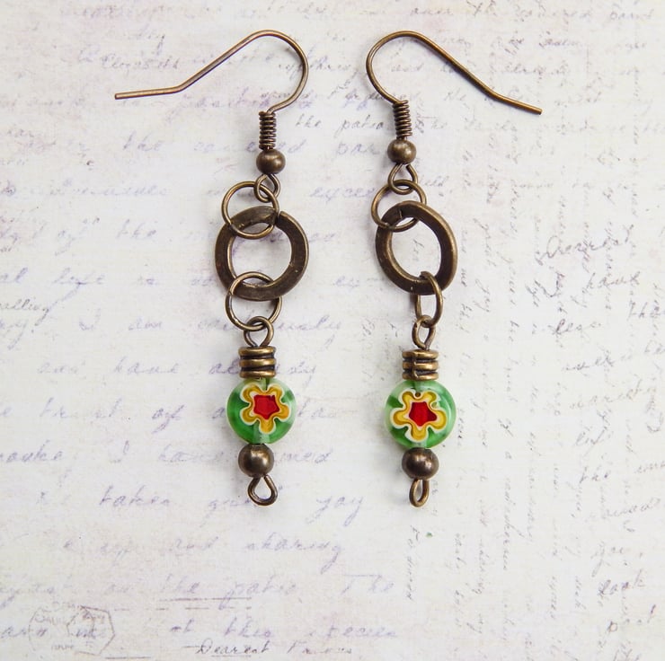 - Small green glass bead with a yellow and red flower design