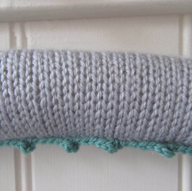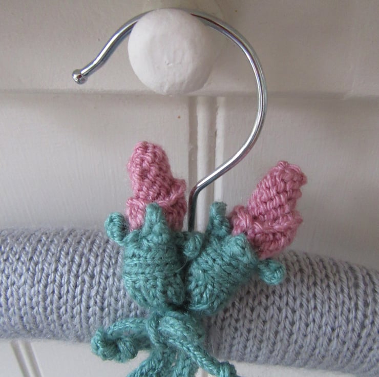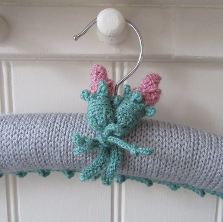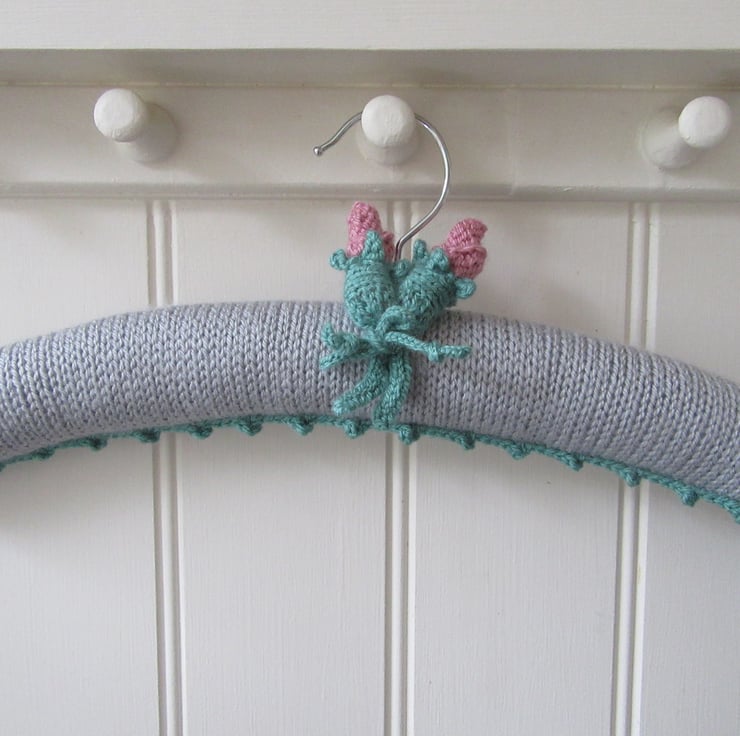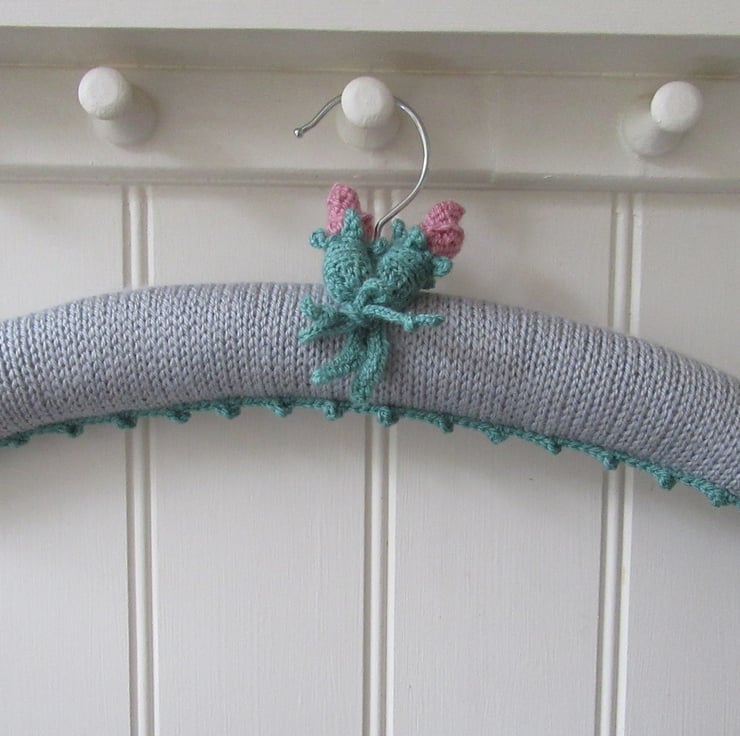A beautiful padded ladies coat hanger hand knitted in silver coloured yarn with rose buds. The cover is knitted with a silver grey coloured yarn in a smooth stocking stitch, with a pale grey/green contrast crochet picot edging. There are two large pink rose buds nestled under the metal hook and secured with the same grey/green handmade cord tied in a bow. The wooden base is generously wrapped in wadding to give a well padded coat hanger.