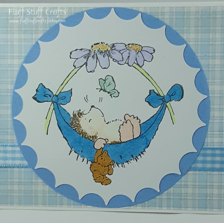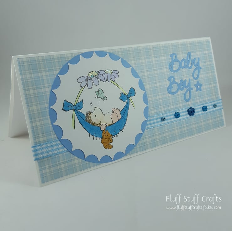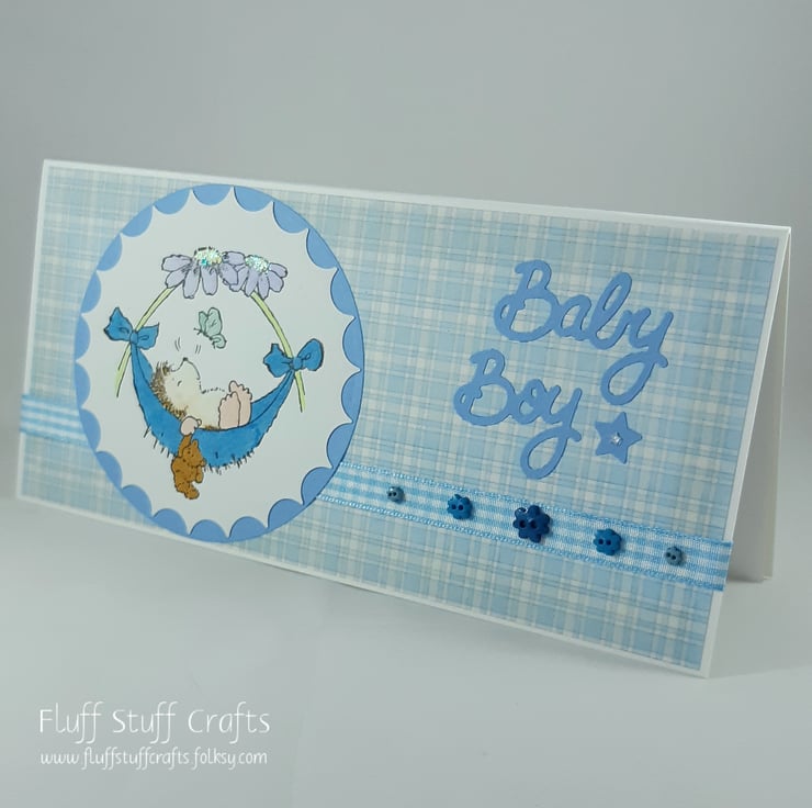 DL sized card featuring a hand stamped and coloured image of a baby hedgehog in a hammock. The image has been mounted on blue card and layered over blue gingham ribbon with blue buttons on a pale blue checked background. The words 'Baby Boy' have been die cut from pale blue card.