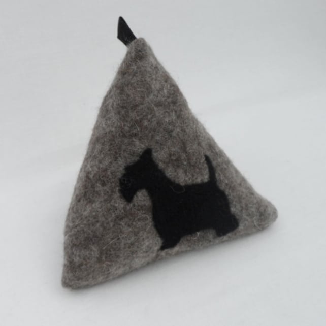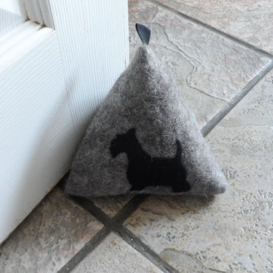 Perfect for scottie dog lovers this triangular pyramid doorstop is made from hand felted natural grey Jacob wool and is decorated with a black scottie dog silhouette on the front surface. The sides all measure 6.5" (16.5cm) giving a height of 6" (15cm). A black fabric tape loop has been added to the top to facilitate lifting. Traditionally filled with dried beans or rice doorstops can attract vermin and therefore I have filled this with washed and dried pea gravel sealed in a plastic bag.