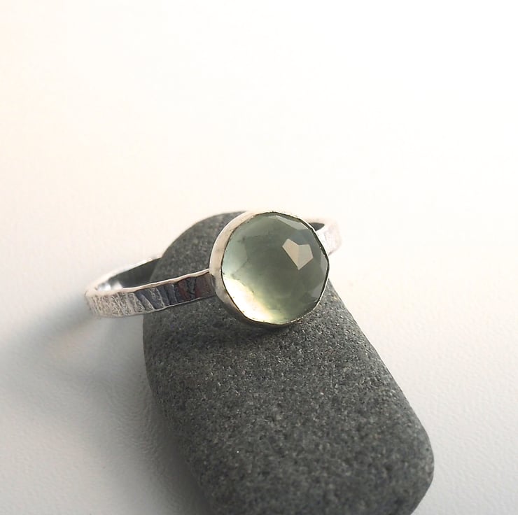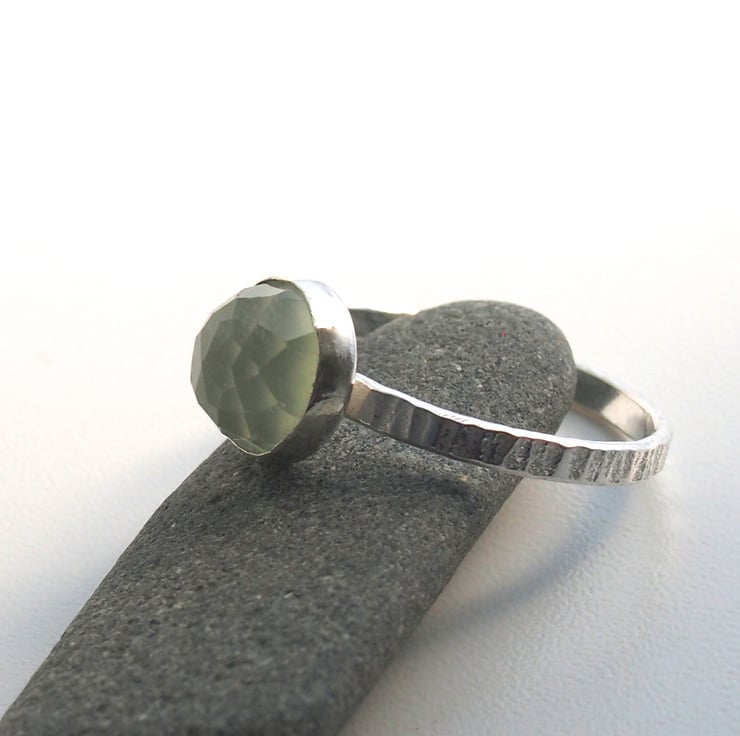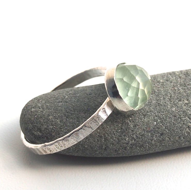 A gorgeous 8mm translucent green prehenite cabochon is set onto a 2mm textured band. This is a lovely quality luminous pale green and rose faceted for sparkle. Stamped with our makers mark registered at the Edinburgh assay office.