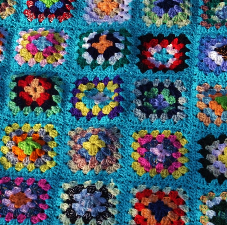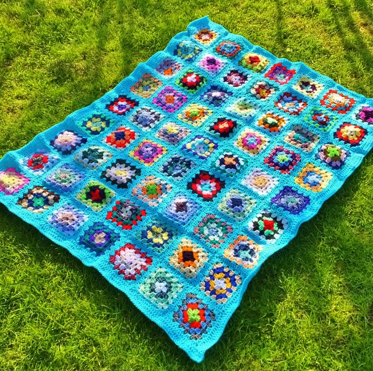 The colour in the photograph is close to real life, all the squares are surrounded with a nice light blue coloured wool.
