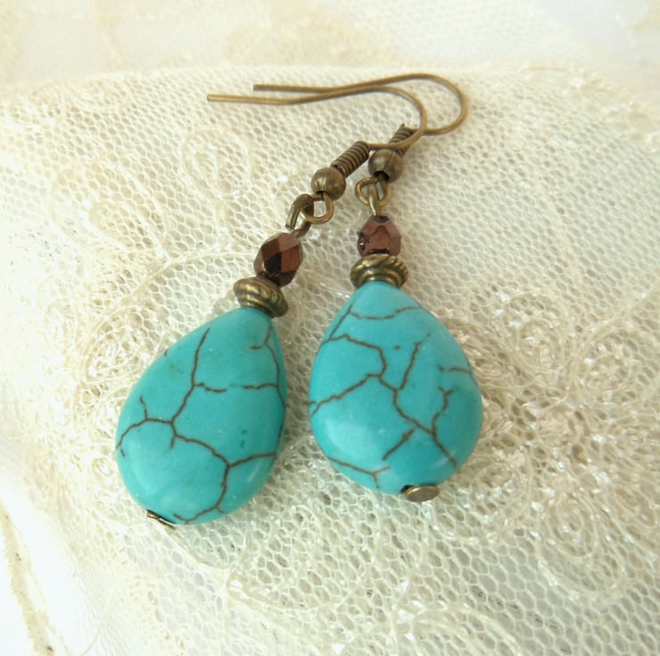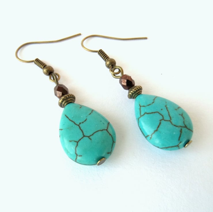 The turquoise teardrops have lovely brown veining running across the surface, in unique designs that characterise this lovely gemstone.