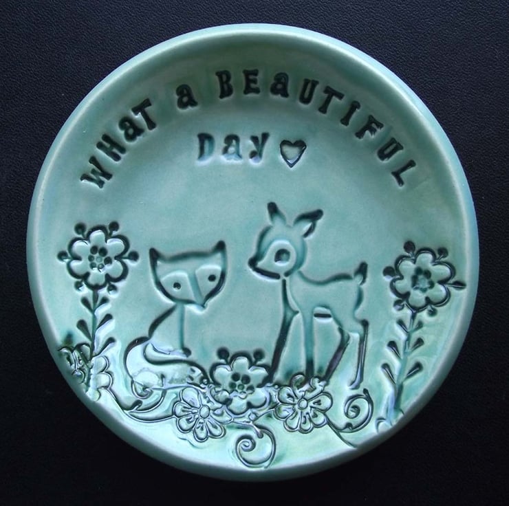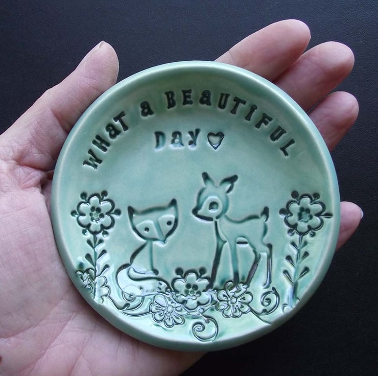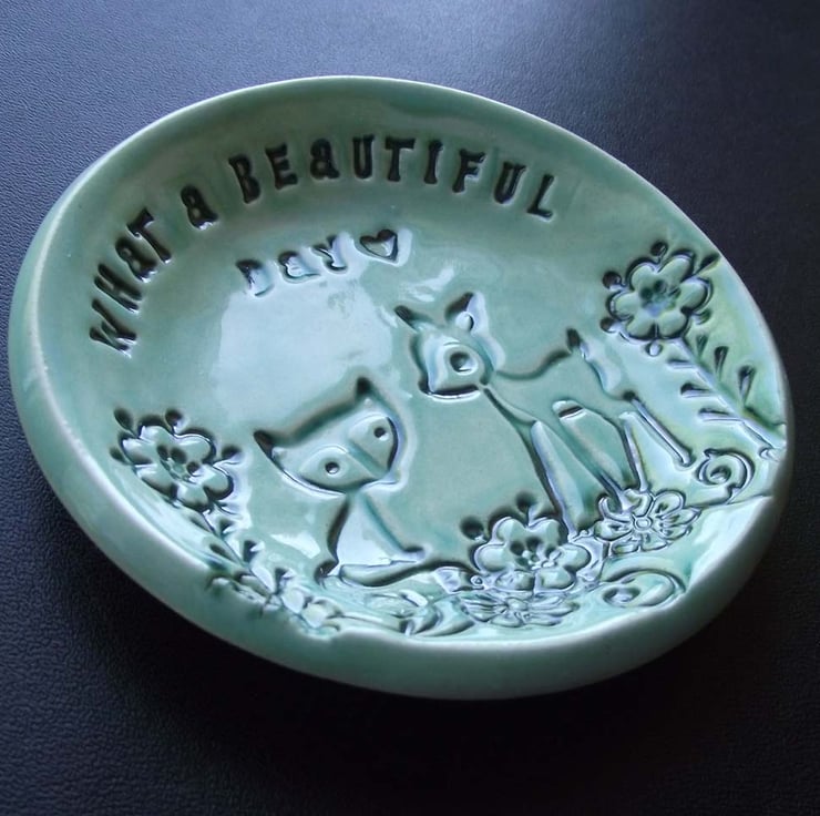 This teeny, little woodland themed dish, is glazed in a blue glaze.
