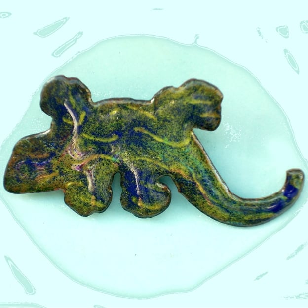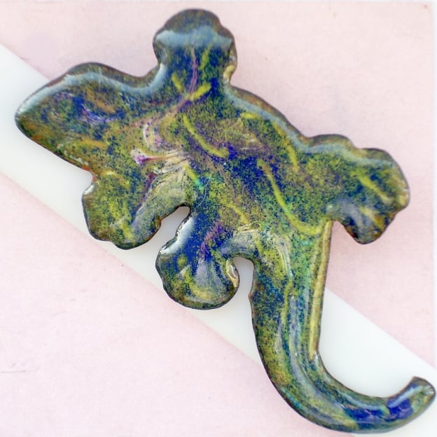 This lizard is made in blue enamel and yellow enamel over clear enamel with a pattern drawn it .