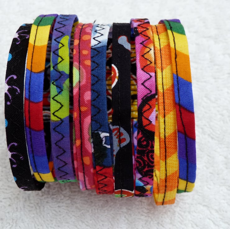 I was inspired to make these fabulous fabric bracelets after having to make lots of bias binding! It just seemed to be a natural progression, and a great bit of fabric art that you can wear!